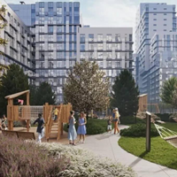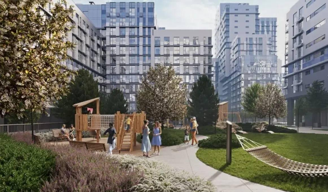 Во дворе организована без барьерная среда с многоуровневым ландшафтным парком, детскими площадками, различными зонами отдыха и многочисленными арт-объектами.