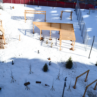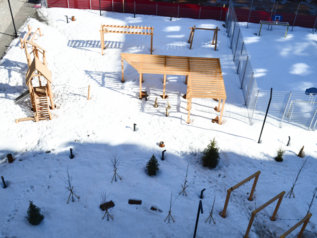 Особенности ЖК:вход на первый этаж с уровня земли — никаких ступеней;просторная колясочная на первом этаже: удобно хранить велосипед, лыжи, коляску и т. д.;лапомойка: легко очистить лапы питомца после прогулки;щиты для подключения интернета на этажах — без дополнительного монтажа;детская песочная фабрика и взрослые полноразмерные ели во дворе — изюминка проекта.