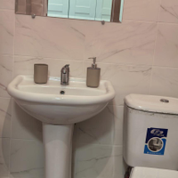 ремонт включает в себя натяжные потолки, на полу ламинат, керамогранит на полу в санузле, плиткой выложенный санузел.
