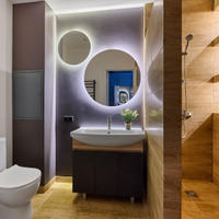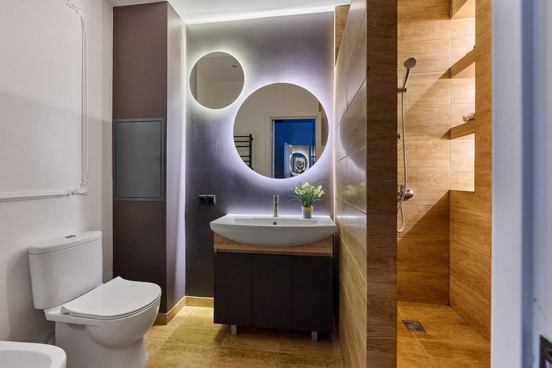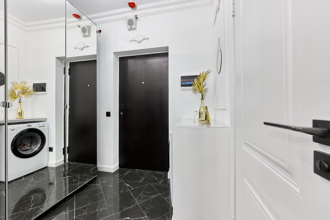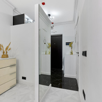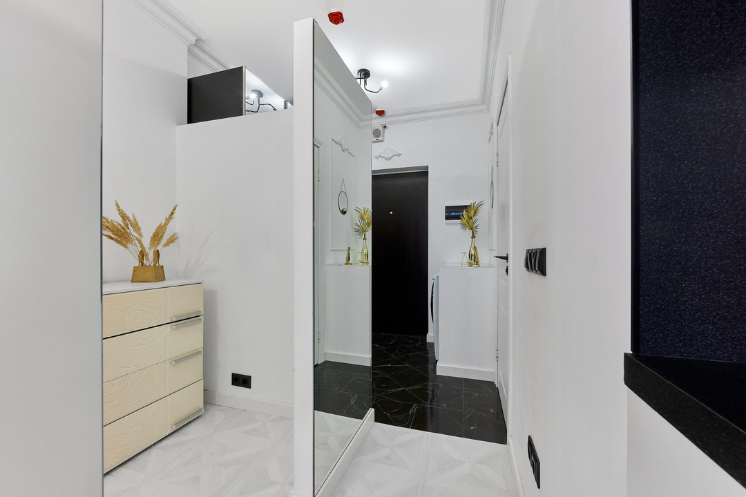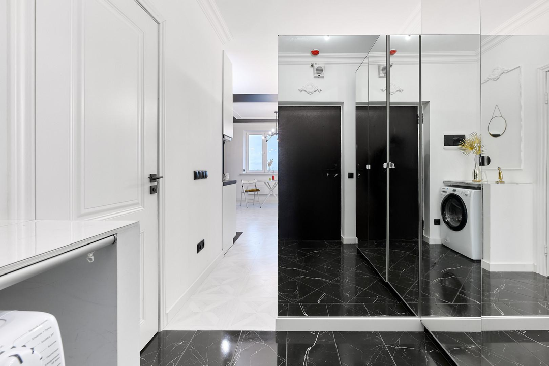 В интерьере использованы зеркала для визуального расширения пространства.