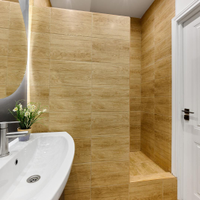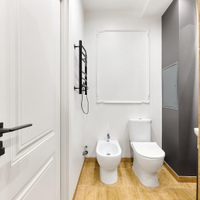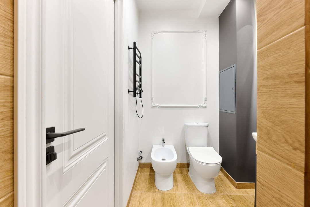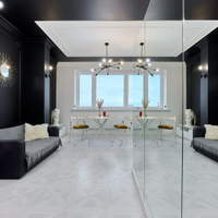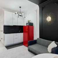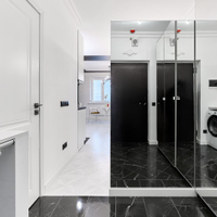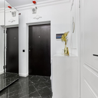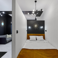 Зона спальни отделена. Квартира полностью укомплектована мебелью, бытовой техникой и дизайнерскими предметами интерьера. Санузел оснащен современной сантехникой (душевая, биде, унитаз, умывальник с хранением) и дизайнерскими зеркалами с подсветкой.