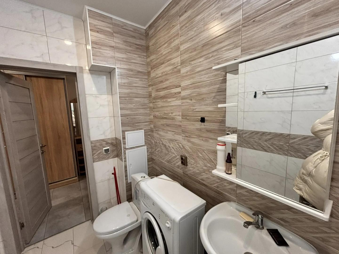 Совмещенный санузел также выполнен в современном стиле с использованием качественных материалов.