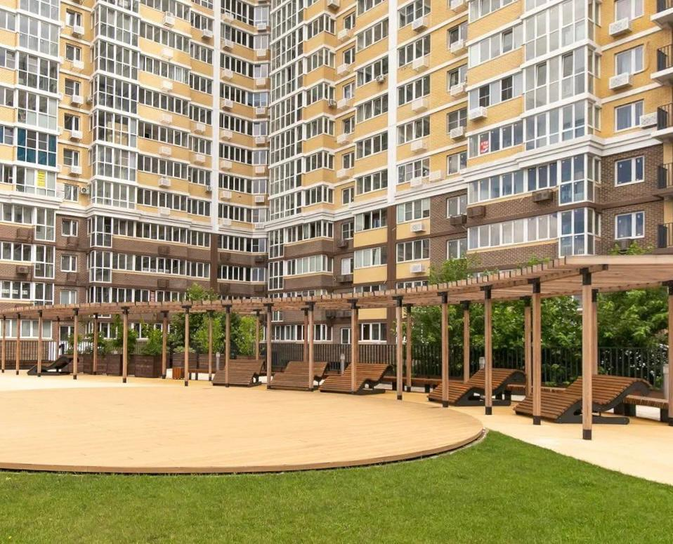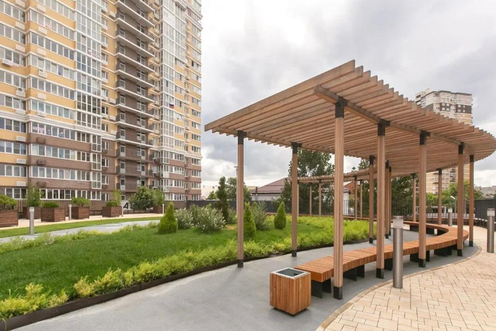 Во дворе детские площадки, современные спортивные площадки для разных возрастов, аллея с местами для отдыха.