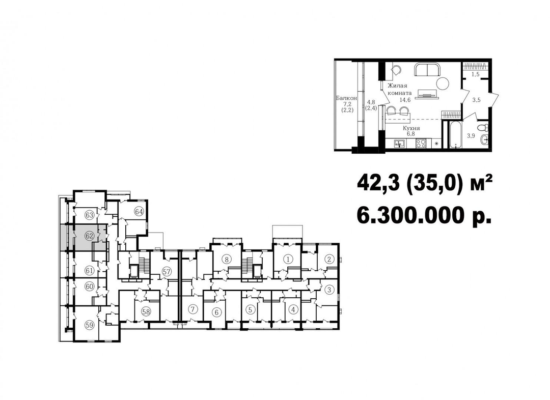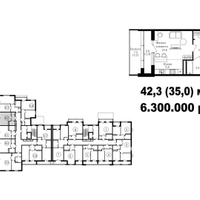 Продается студия общей площадью 34.9 м2, жилой площадью 21.3 м2, кухня 7.3 , санузел совмещенный 4.3 м2. Фактическая площадь с балконом и лоджией 42.3 м2.