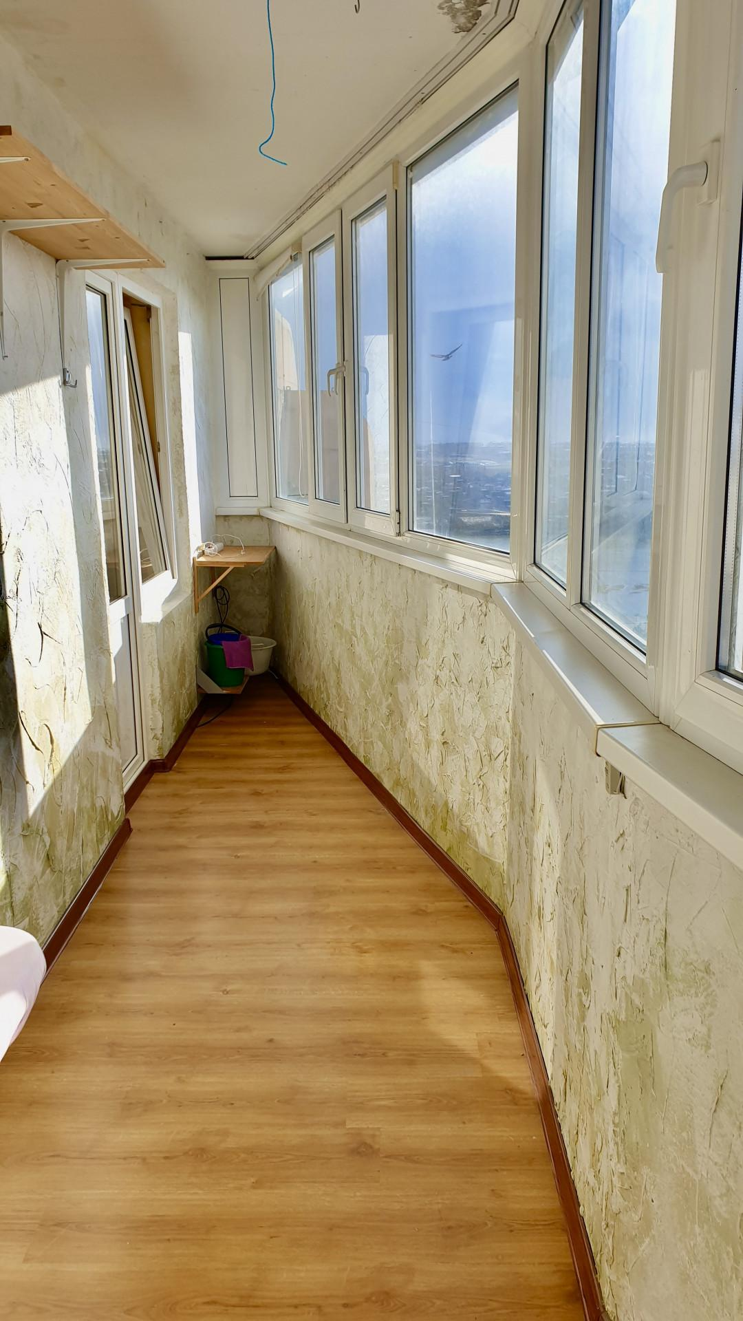 Лоджия-зона отдыха: застеклённая, с видом на город, идеально для работы или релаксации.