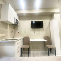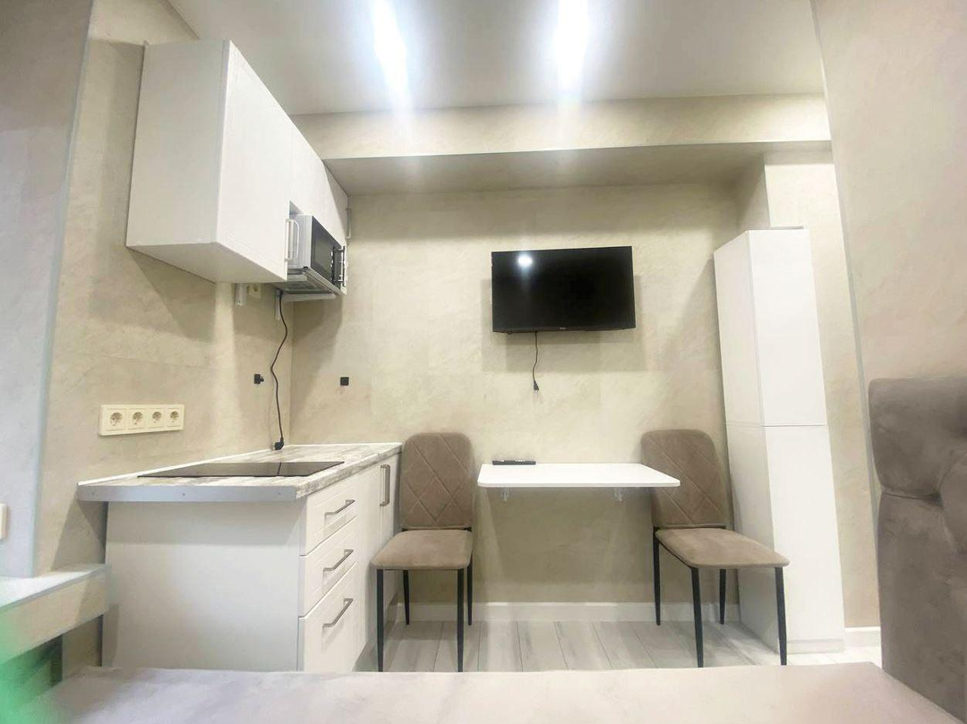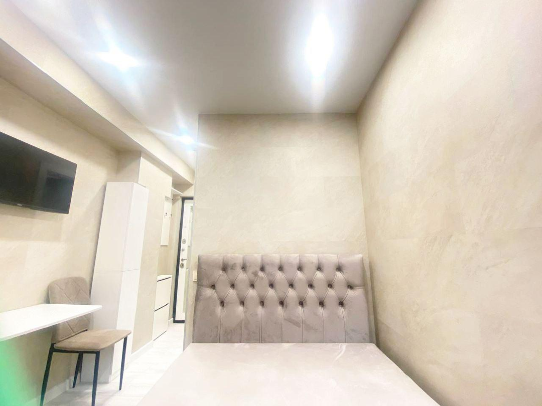 - в студии - кровать, стол, стулья, ТВ,