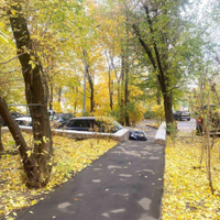 Чистый подъезд. Из окна открывается вид на двор, растут кустарники и деревья, есть парковочные места.