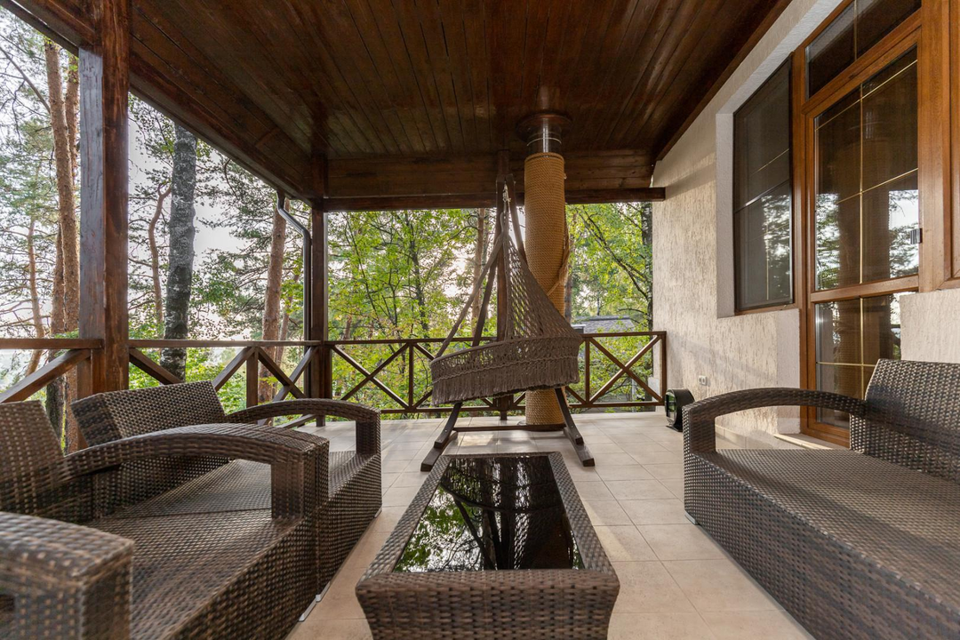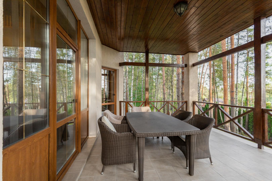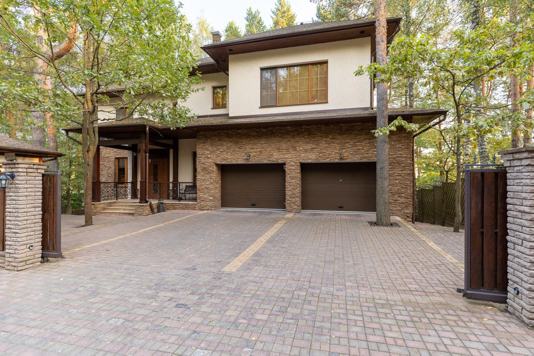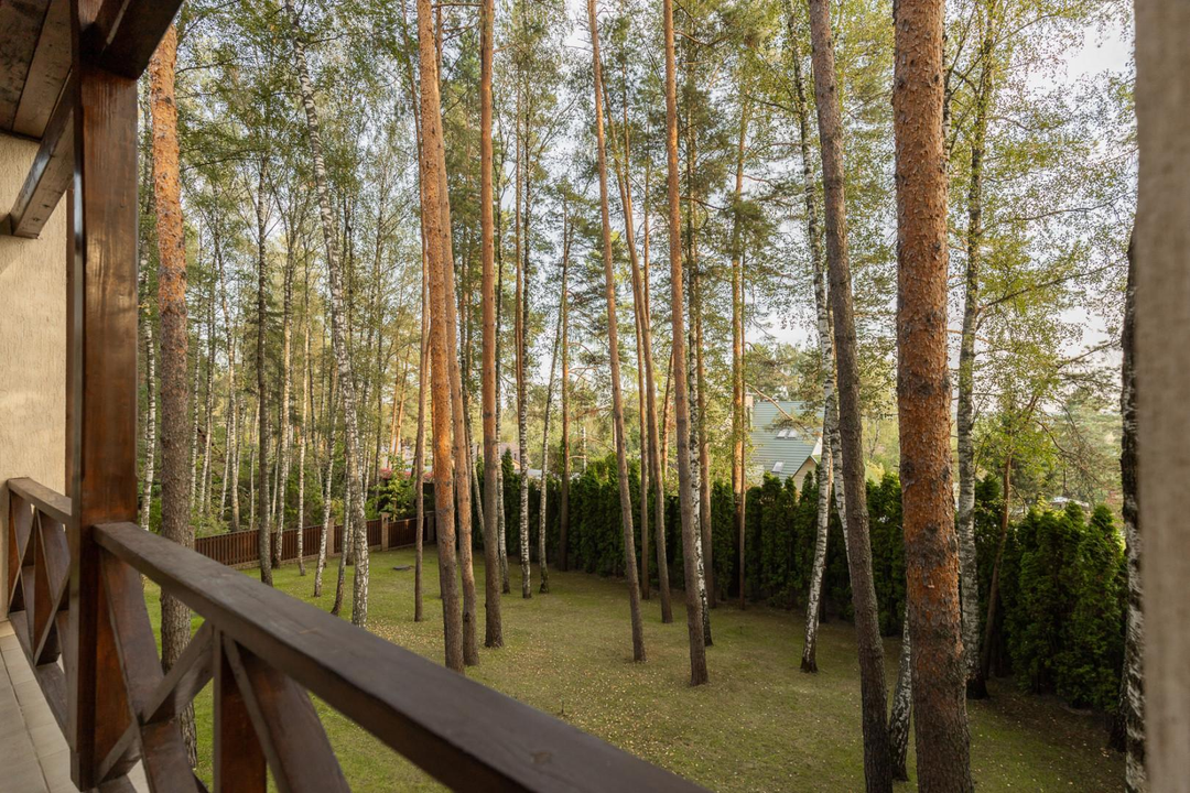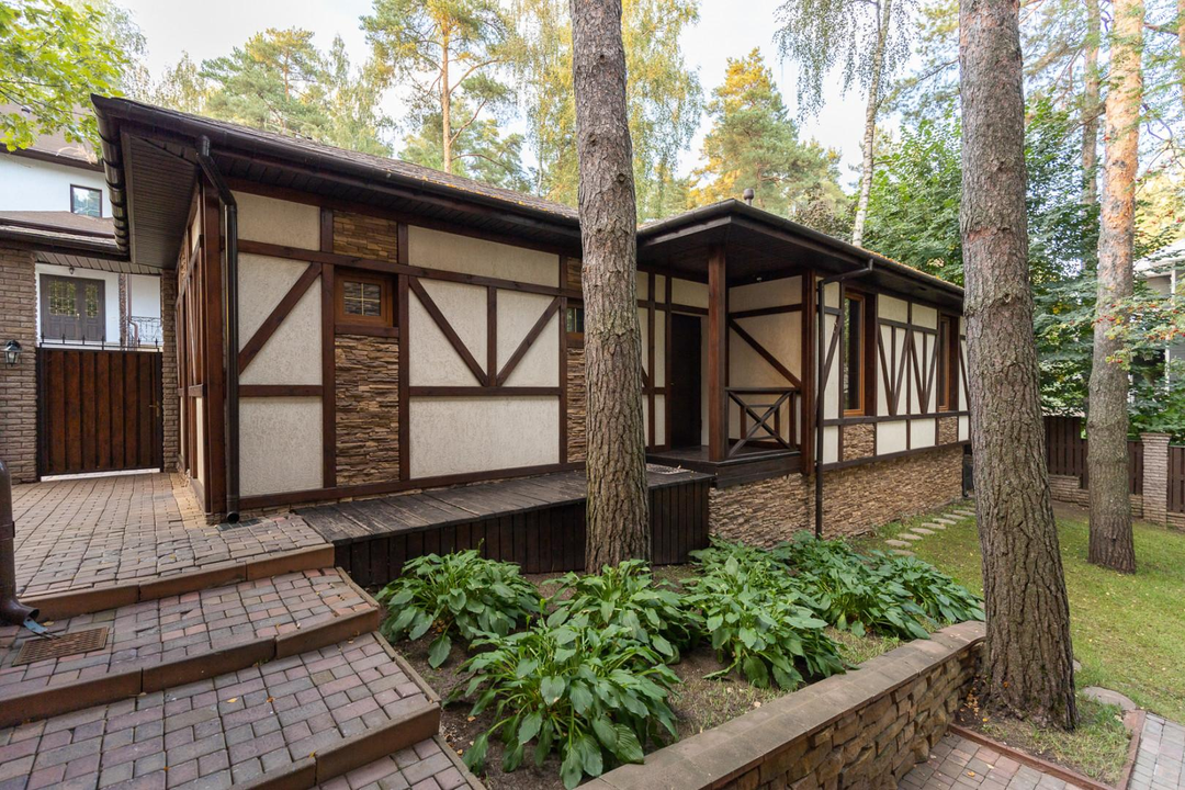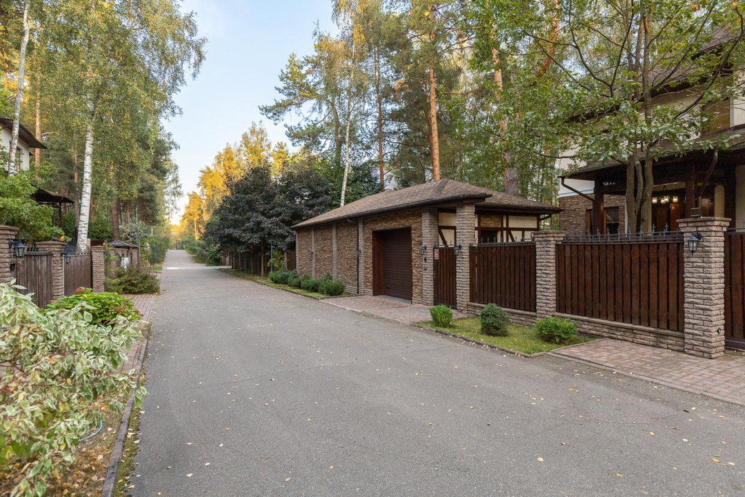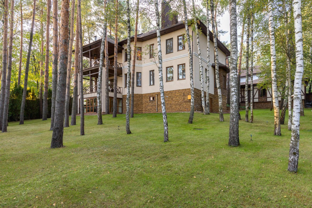 Участок в 17,5 соток утопает в зелени сосен, берез и туй. На территории также имеется отдельный дом площадью 120 кв. м для персонала, в котором расположены кухня, столовая и две спальни. Здесь же находится гараж для 2 квадроциклов и спортивного инвентаря.