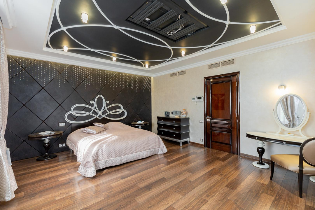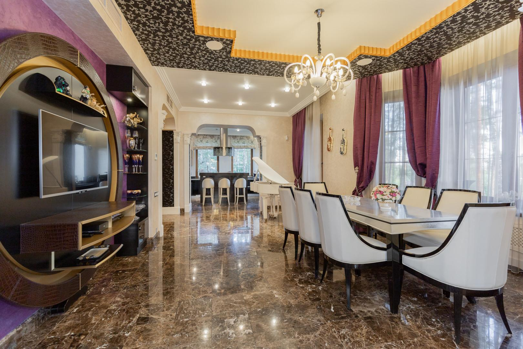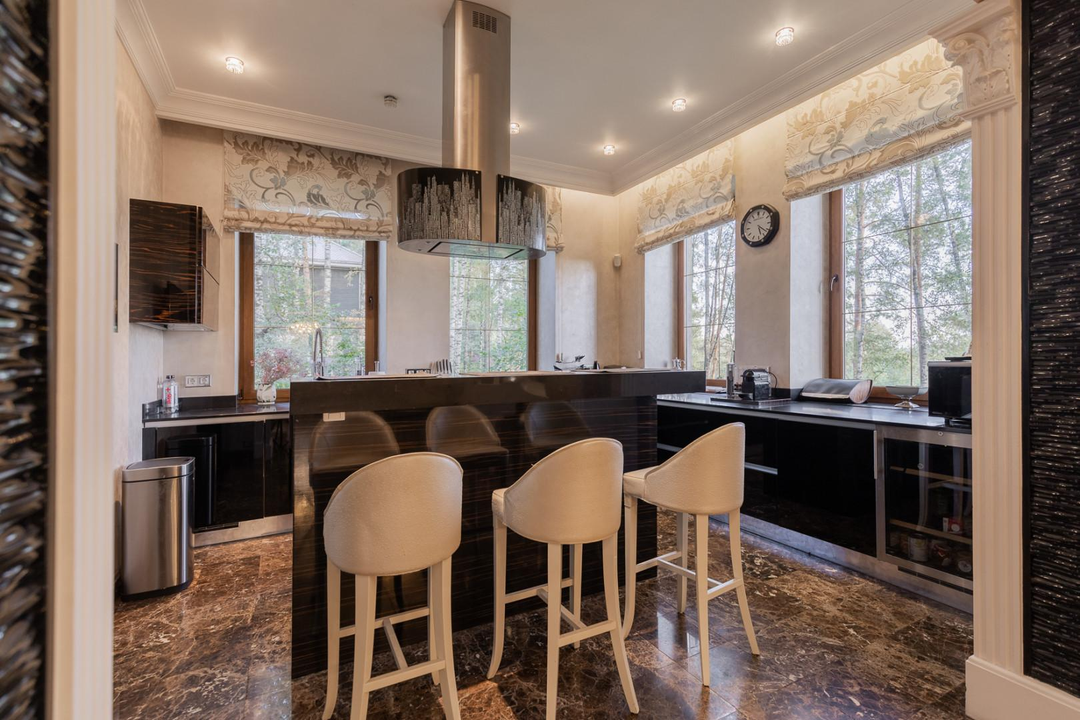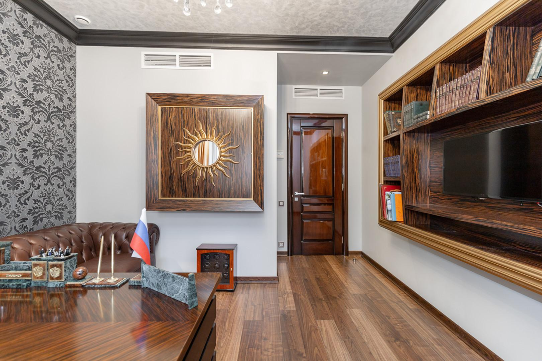 Интерьеры дома оформлены с использованием качественной мебели, изготовленной на заказ — это говорит о высоком уровне комфорта и стиля.