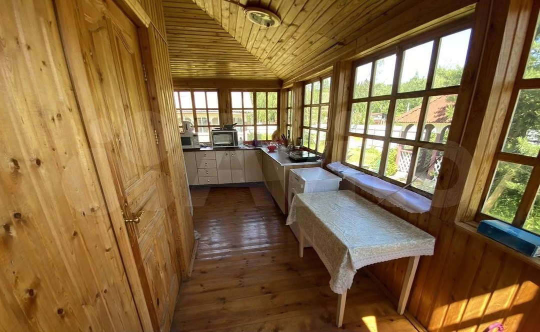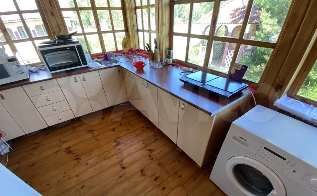 На первом этаже баня, кухня с посудомоечной и стиральной машиной, веранда-гостиная.