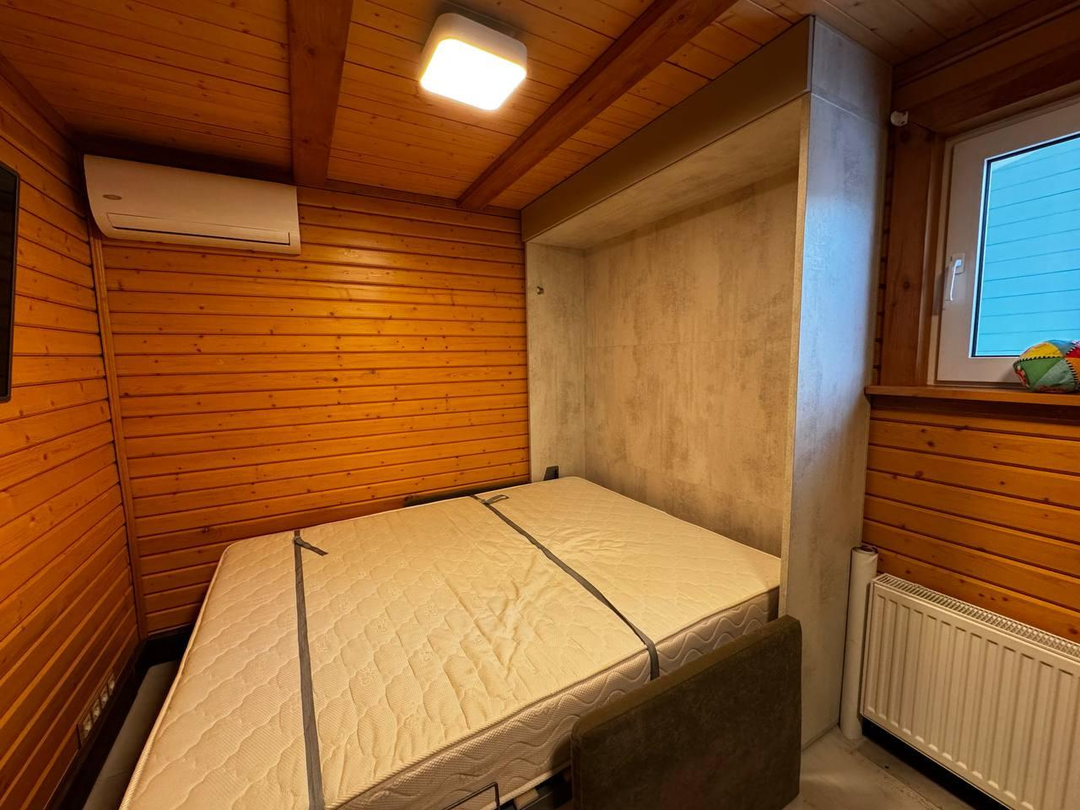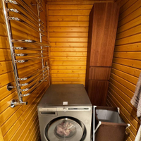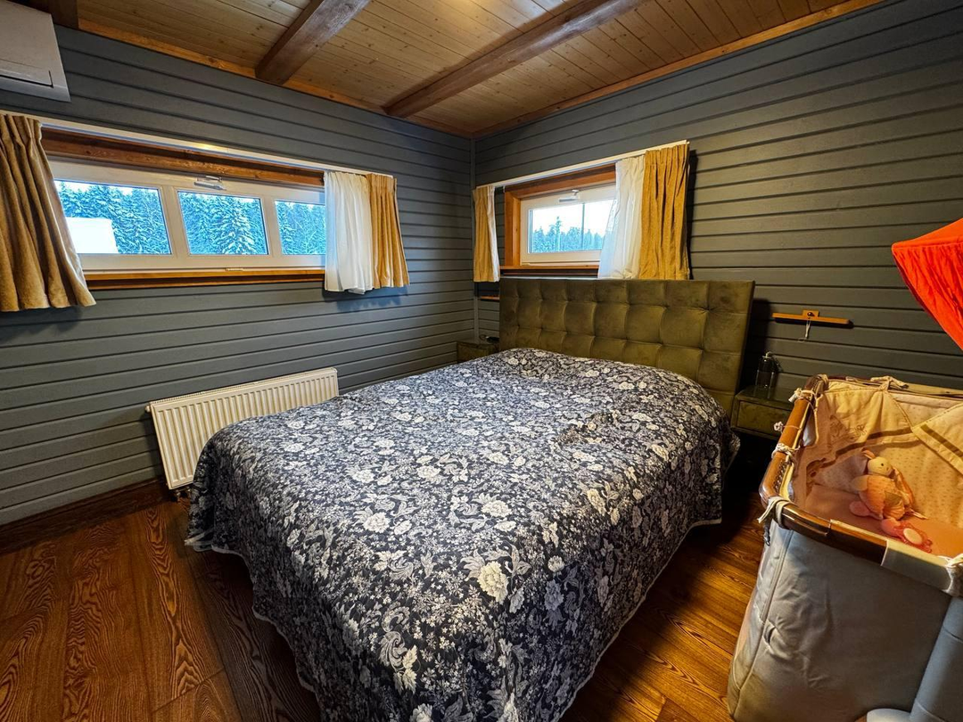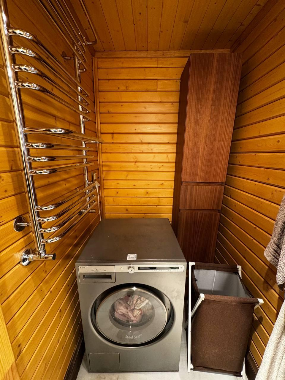 Что внутри:1‑й этаж: тамбур с закладкой дров, коридор с подсобкой, санузел с котельной, кухня‑гостиная (32 м²), спальня, постирочная, душевая, парная.