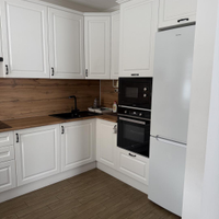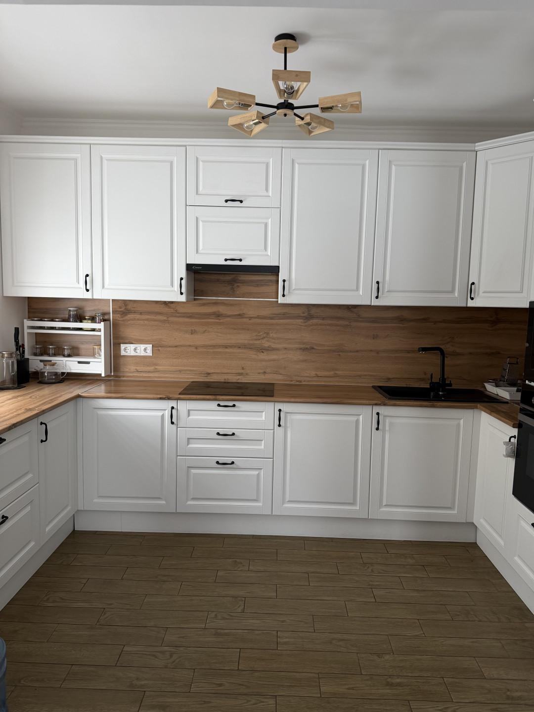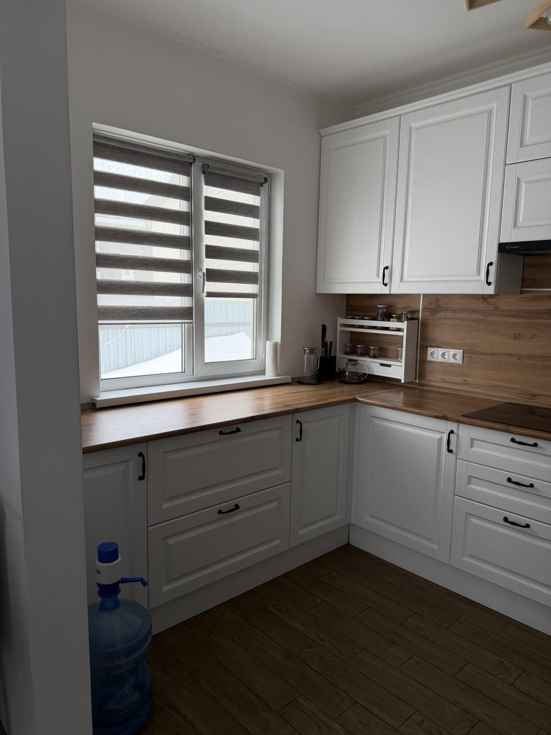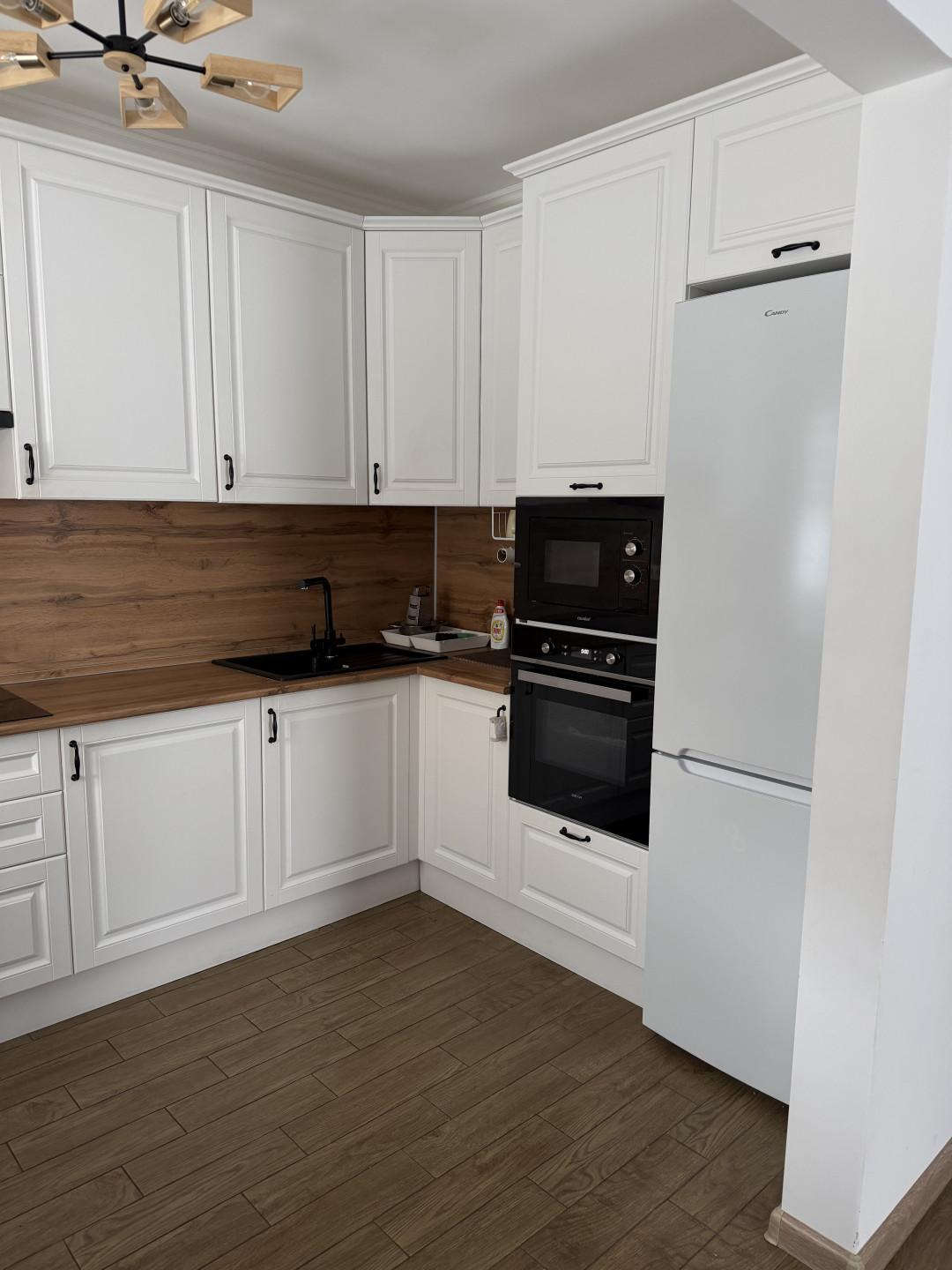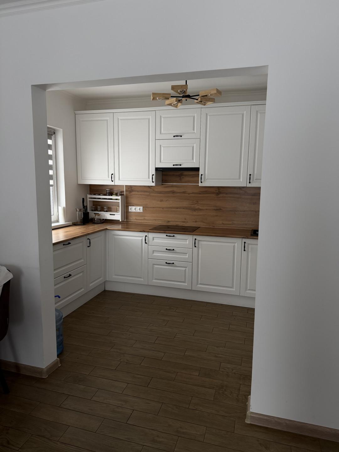- Просторная кухня-гостиная. Кухня изготавливалась под заказ со встраиваемой техникой.