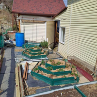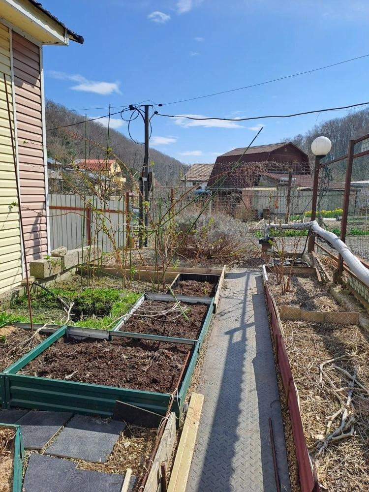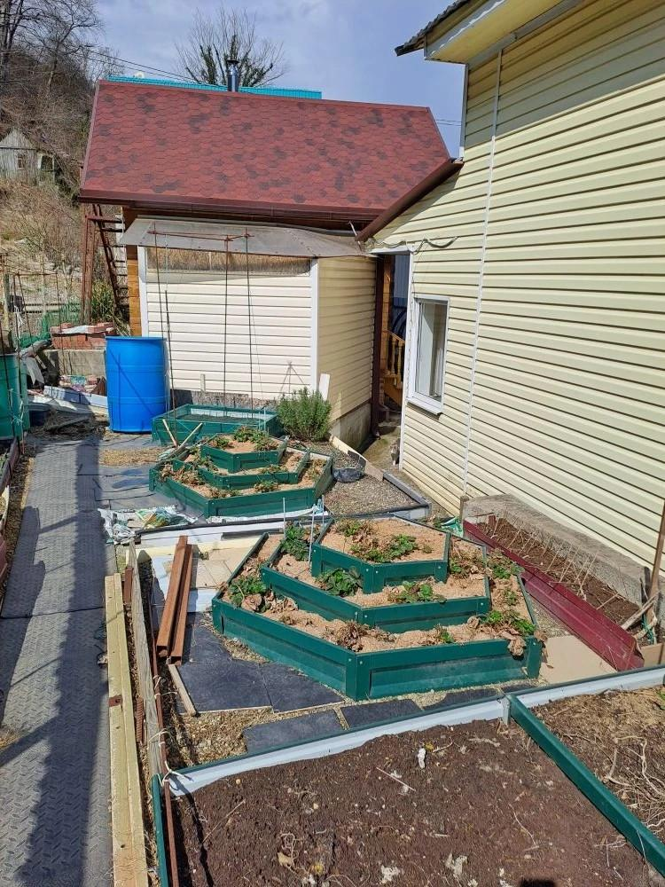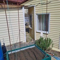 Участок (3 сотки) огорожен забором из металлопрофиля. Во дворе — бетонное покрытие, место для автотранспорта, распашные ворота. Есть небольшой огород, весной здесь всё зазеленеет.