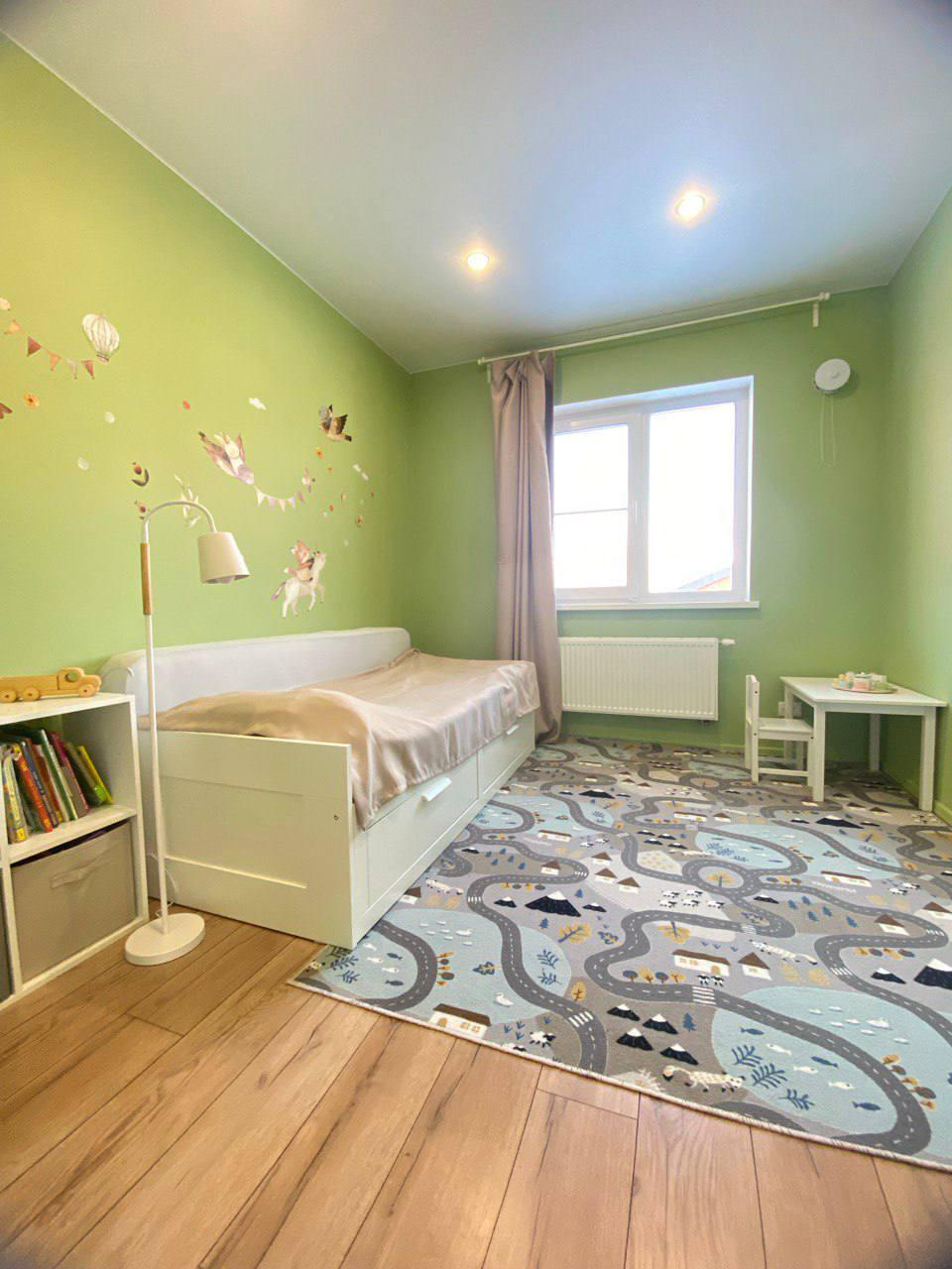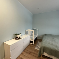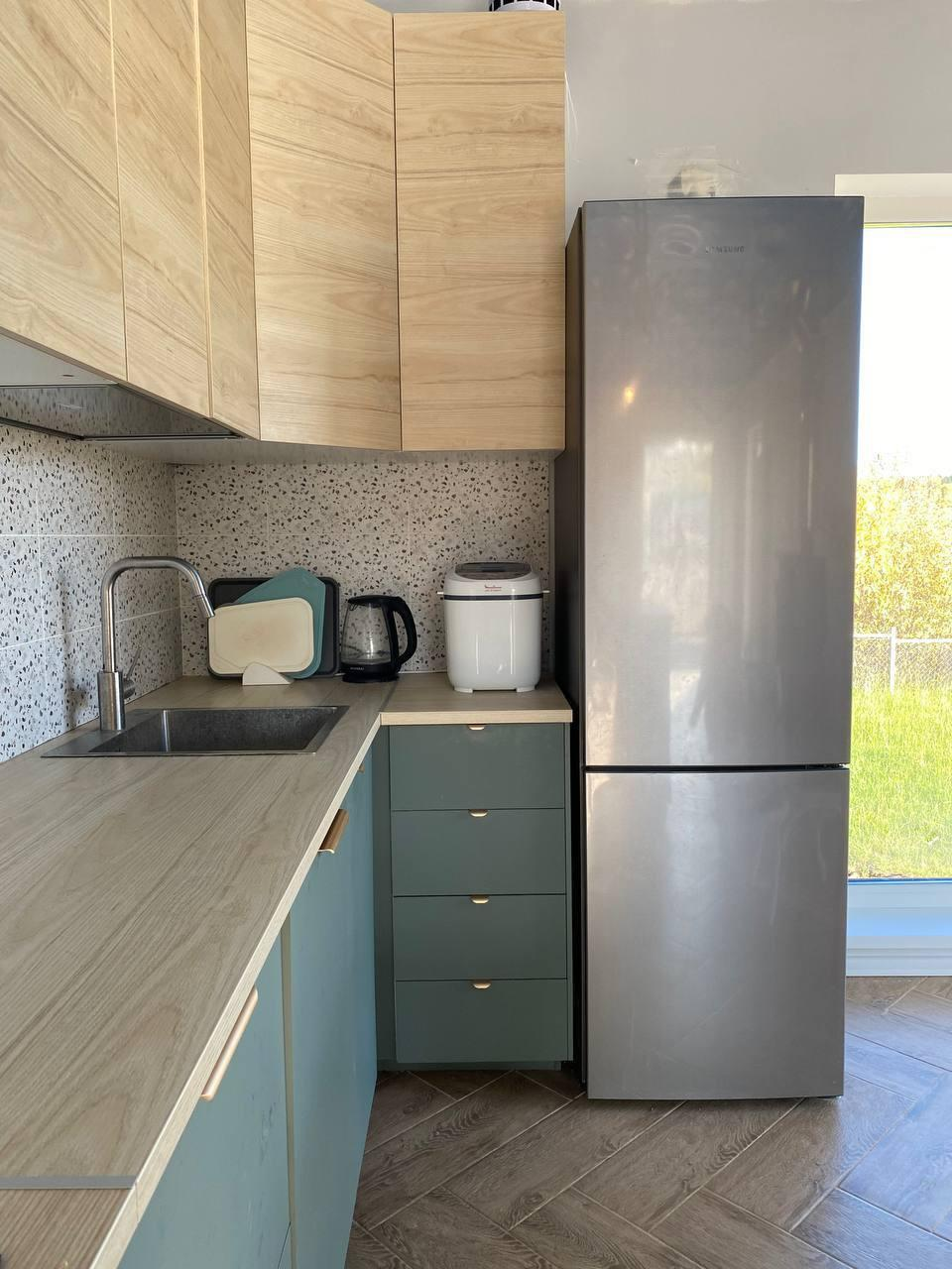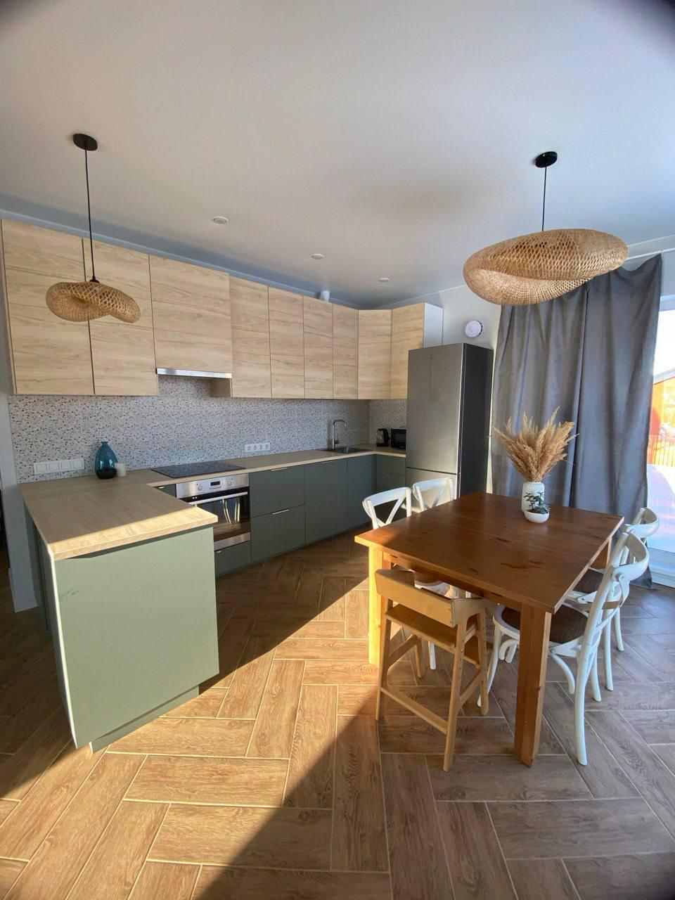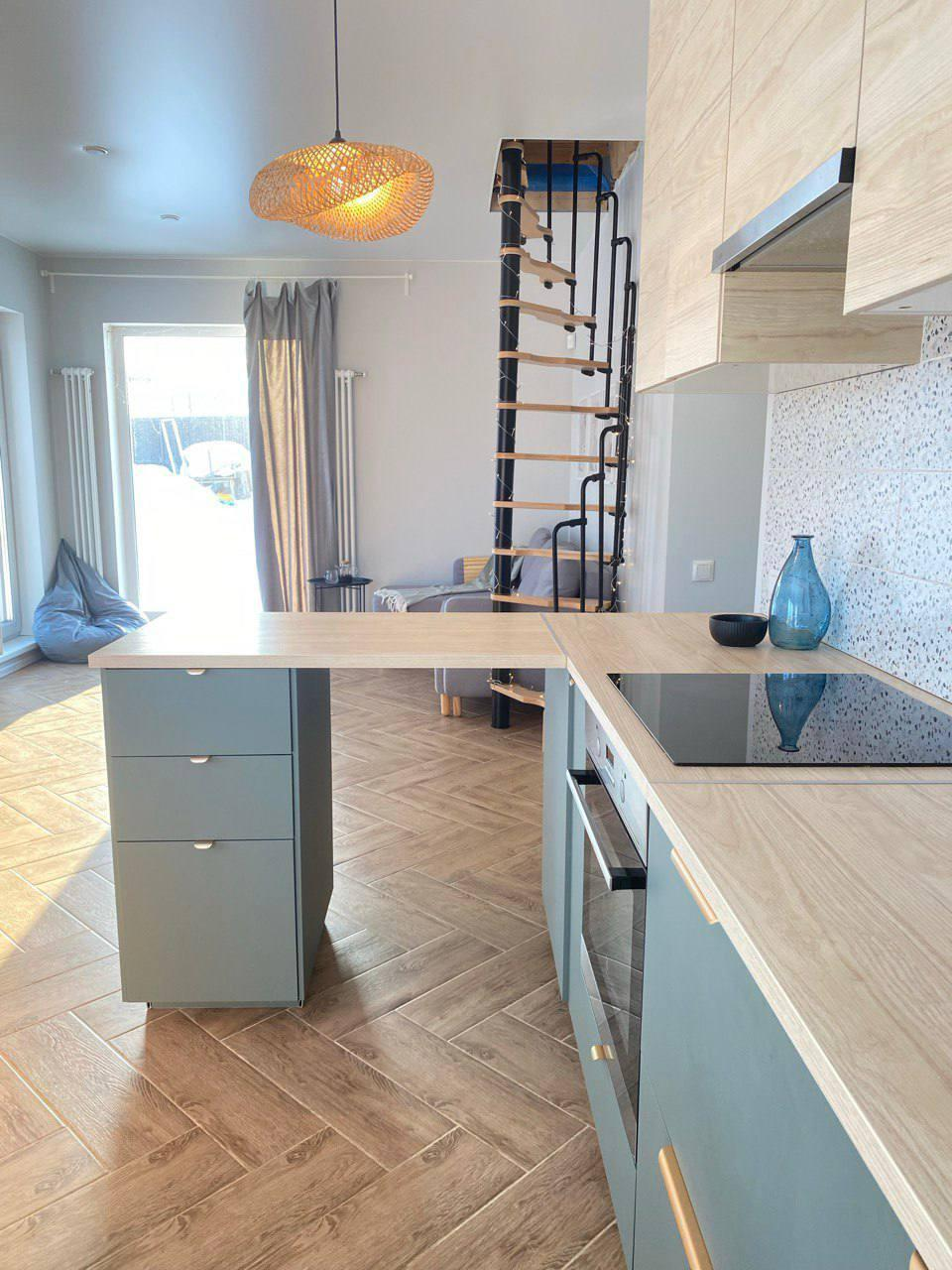 Первый этаж - большая кухня-гостинная, мастер - спальня (спальня со своей ванной комнатой), детская комната, кабинет (гостевая комната) , душевая, с/у и сауна, бойлерная. Кухня IKEA, полностью оборудованная, установка июль 2022( наверно, мы были последними))