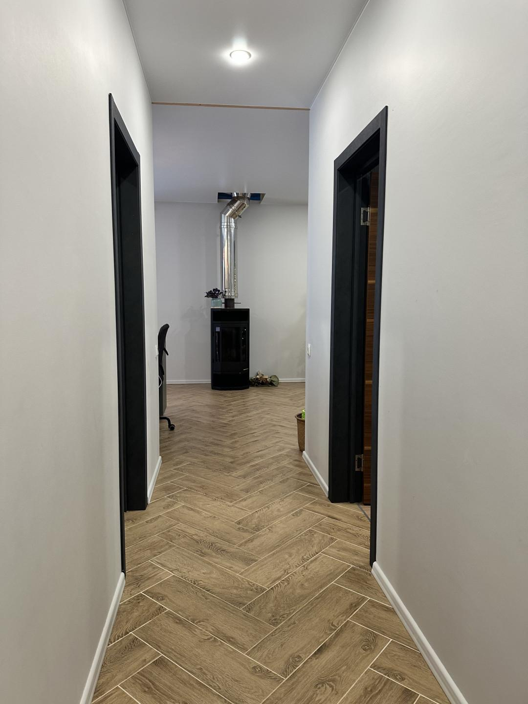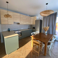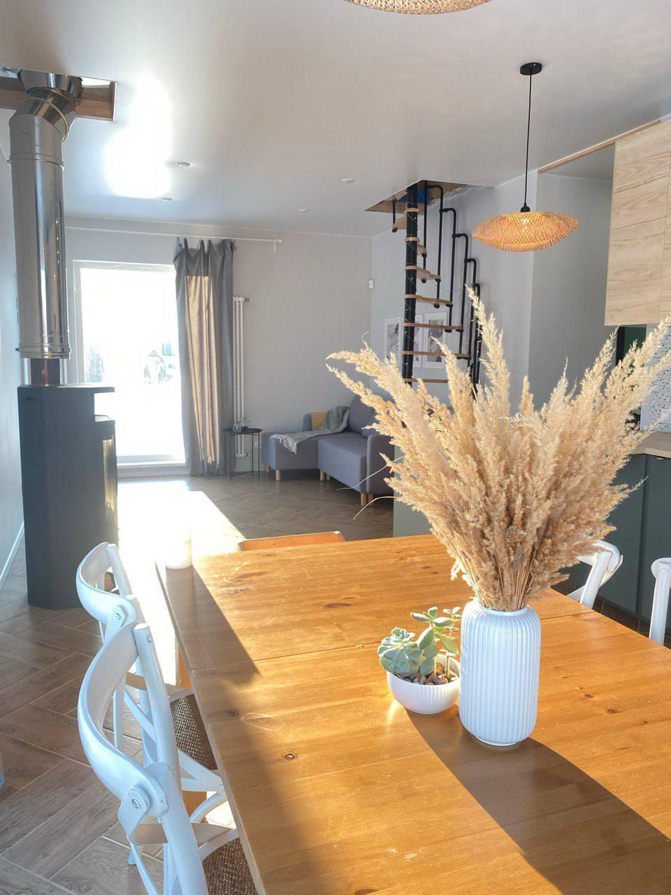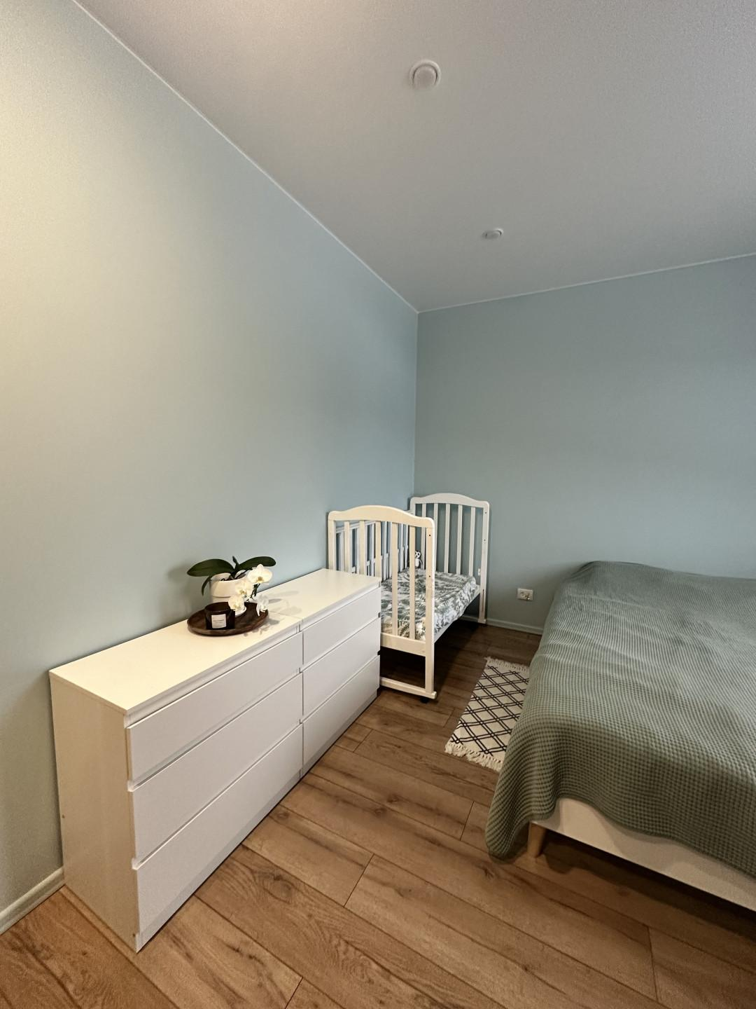 Первый этаж - большая кухня-гостинная, мастер - спальня (спальня со своей ванной комнатой), детская комната, кабинет (гостевая комната) , душевая, с/у и сауна, бойлерная. Кухня IKEA, полностью оборудованная, установка июль 2022( наверно, мы были последними))