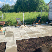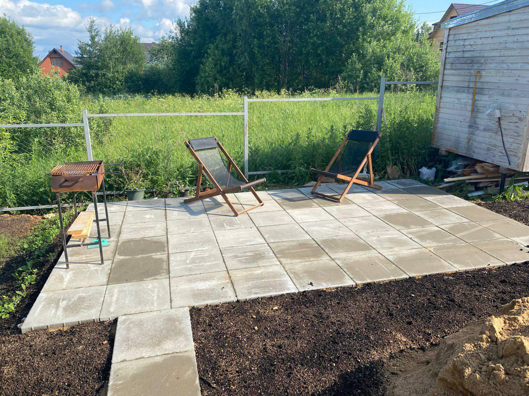 Участок- откатные ворота 6м, залита площадка на 4 авто, есть площадка под барбекю с высокой грядкой для пряных трав.