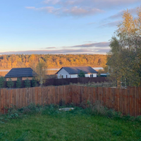 Есть бытовка/хозблок, стоит у забора на 8 винтовых сваях. Участок по одной из сторон досыпан на метр, плоскости выровнены и засеяны газоном. Приятный ненавязчивый деревянный забор по периметру.