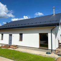 Фундамент- монолитная плита, ребра вниз глубиной до 1,7 м, дренаж под фундамент, утепленная (100мм ЭППС) отмостка, сделан отвод воды с крыши и отмостки.