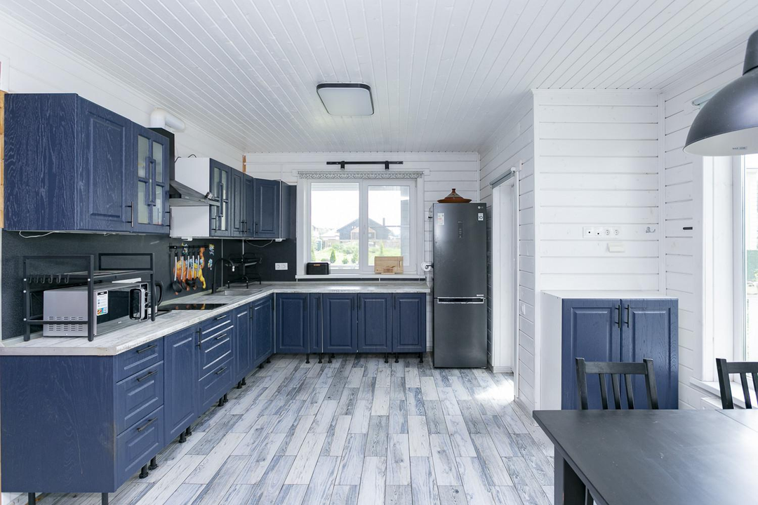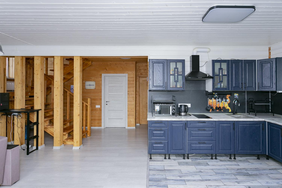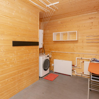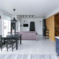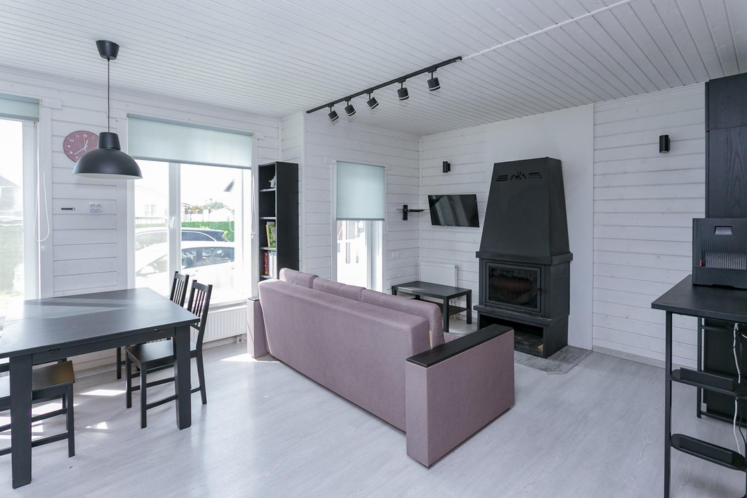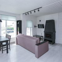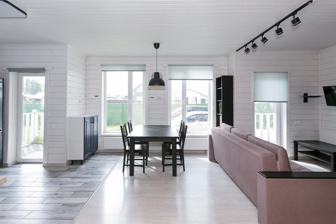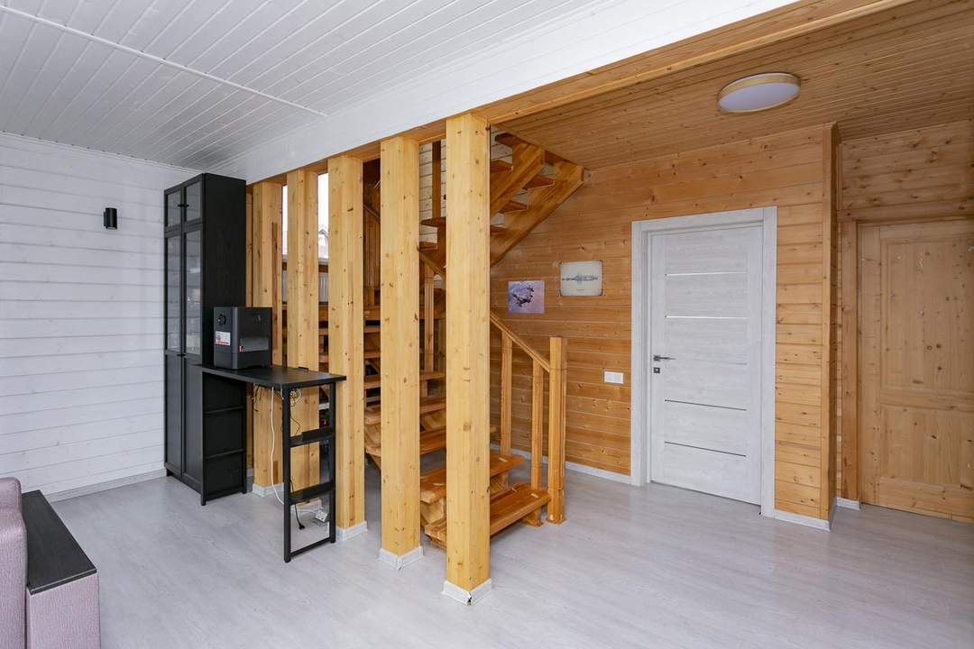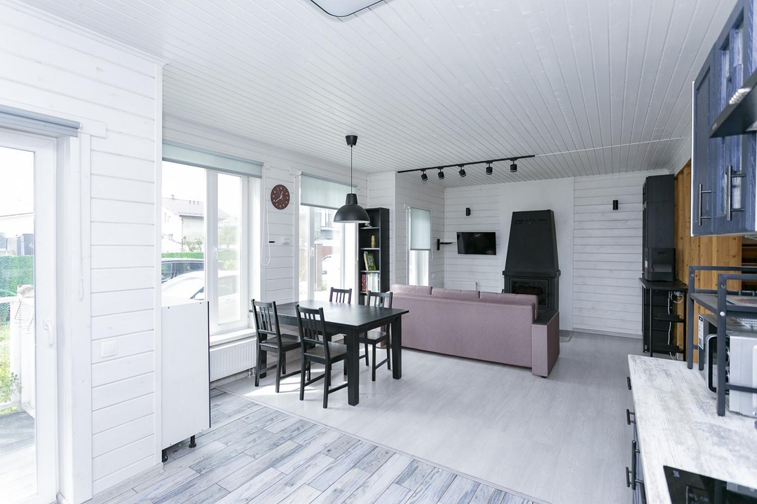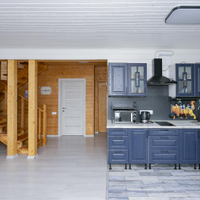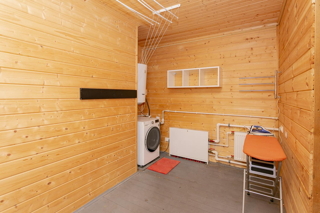 Кухня-гостиная 30 кв.м. с действующим дровяным камином, спальня, котельная (с воодоочисткой), тех.помещение (постирочная, кладовая), прихожая, санузел с душевой кабиной, постирочной и сушильной зоной. Из гостиной есть выход на террасу 21 кв.м.