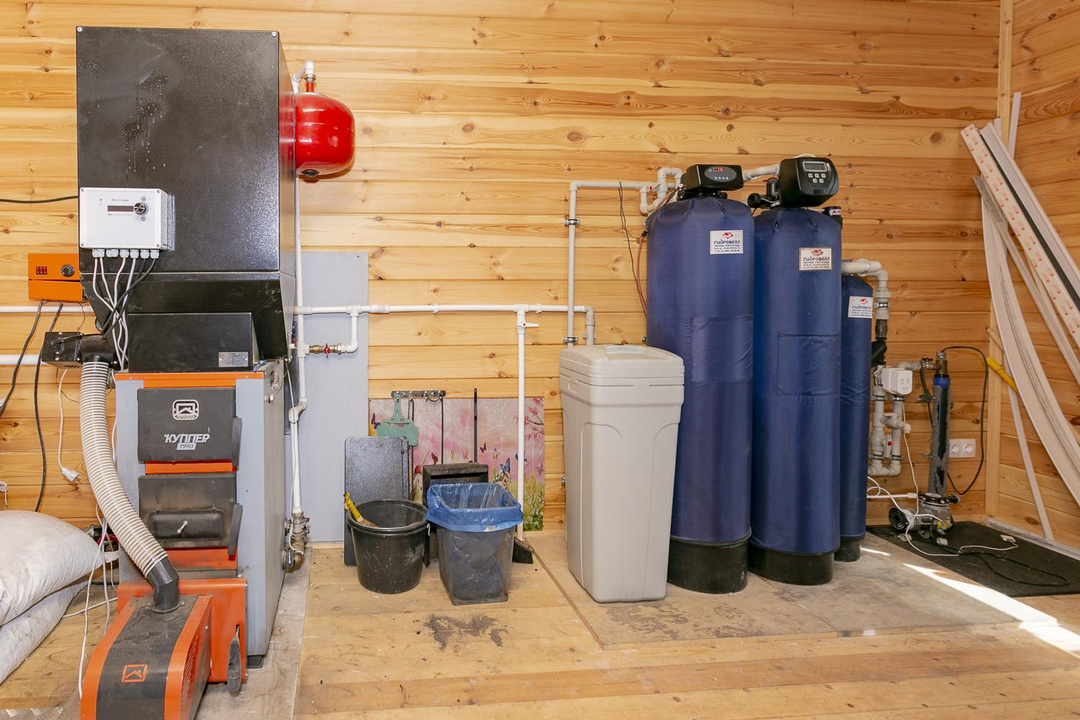 Водоснабжение: скважина в стальном кессоне, баки водоочистки в доме, бойлер, отопление - пеллетный котел с водяным нагревом обогревателей в каждой комнате.