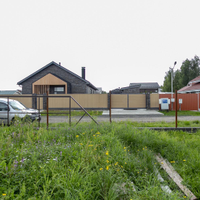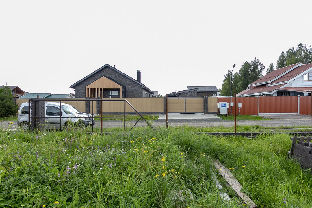 На участке бытовка и хозблок из облегченного бруса. На въезде откатные ворота . Въездная группа и парковочные места - бетон. Пустой участок не огорожен (выполнена подготовка для установки забора: залита лента, установлены столбы, установлен каркас откатных ворот).