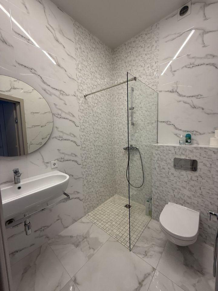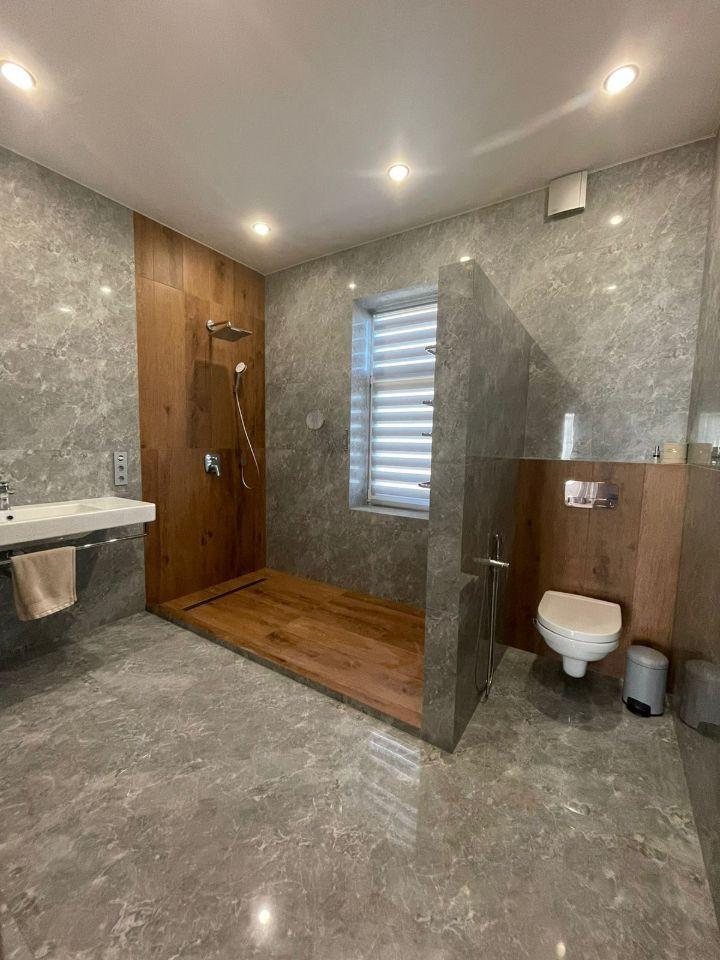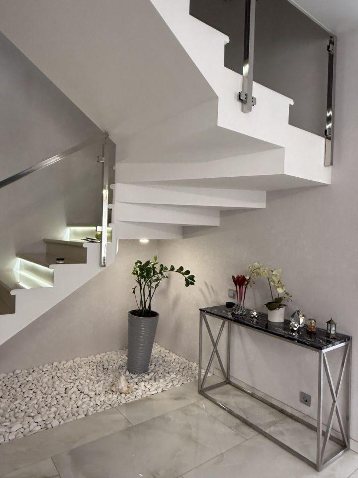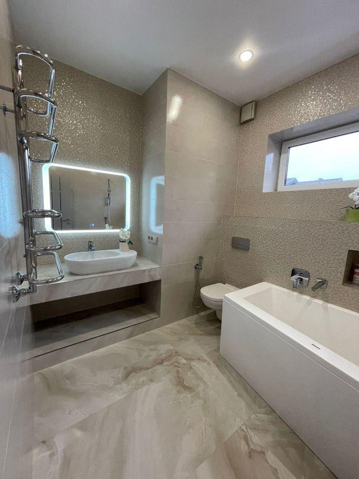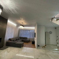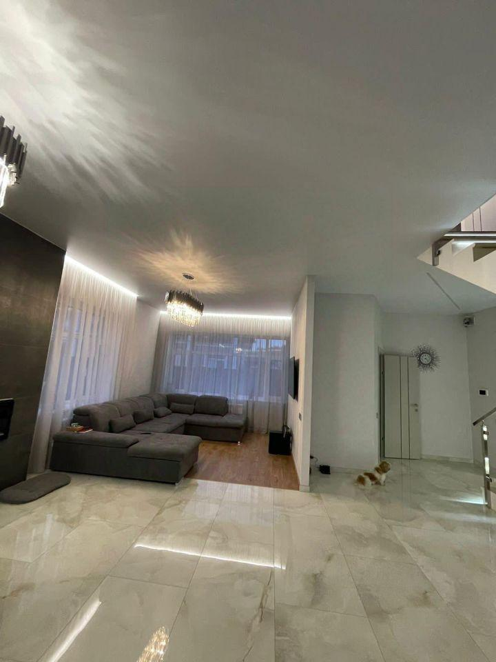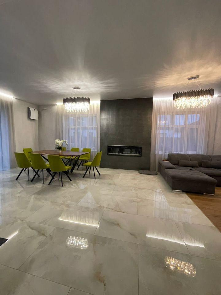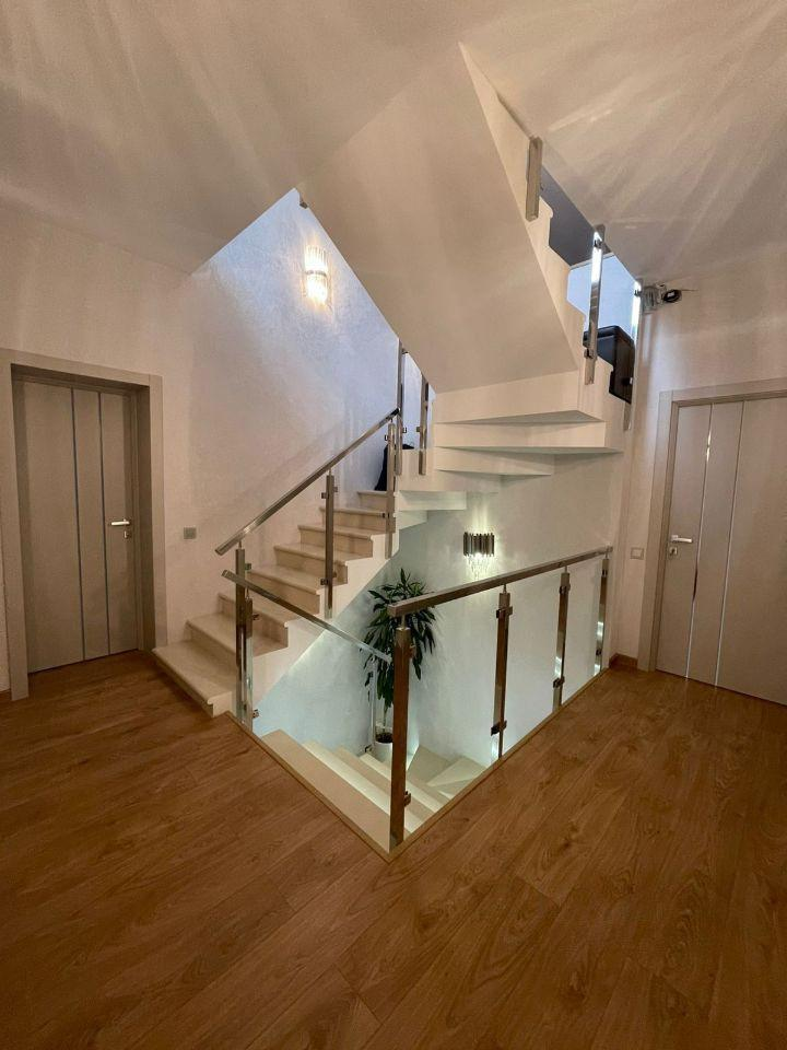 Железобетонная монолитная лестница, шириной 120 см, цельные ступени из керамогранита, с подсветкой, ограждение - нержавеющая сталь и стекло. Натяжные потолки со встроенным освещением и отдельными эффектными люстрами. Установлена премиальная сантехника. Теплые полы по всему 1 этажу, на 2 этаже - в санузлах и на балконе в мастер-спальне. Входная дверь металлическая с терморазрывом, высотой 2.3м, с входом по коду и отпечатку пальца, с возможностью удаленного управления.