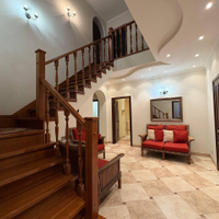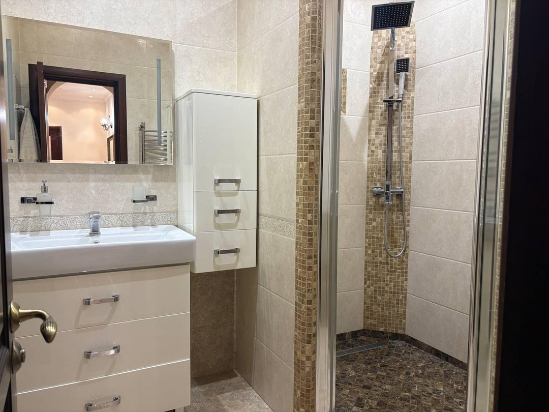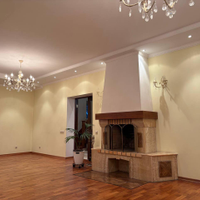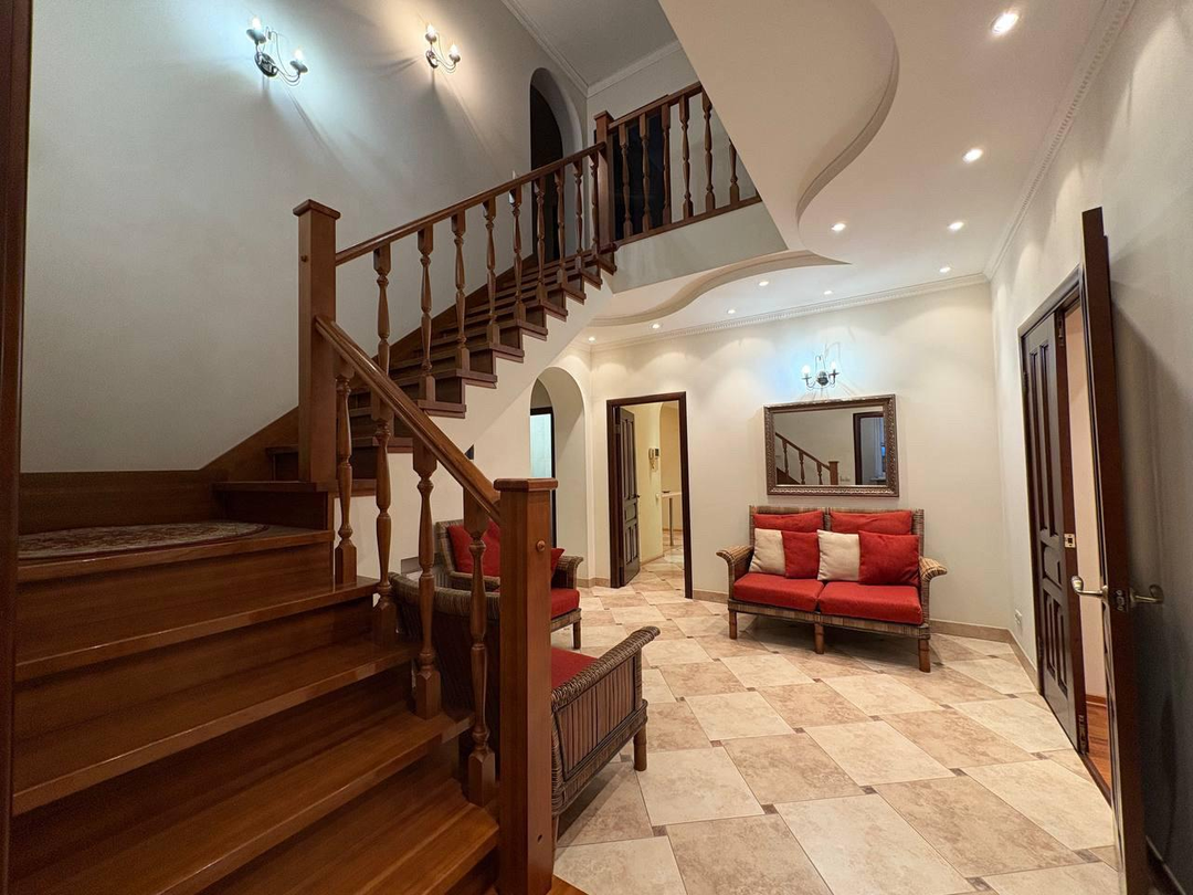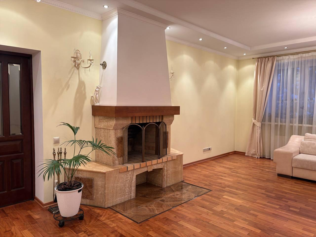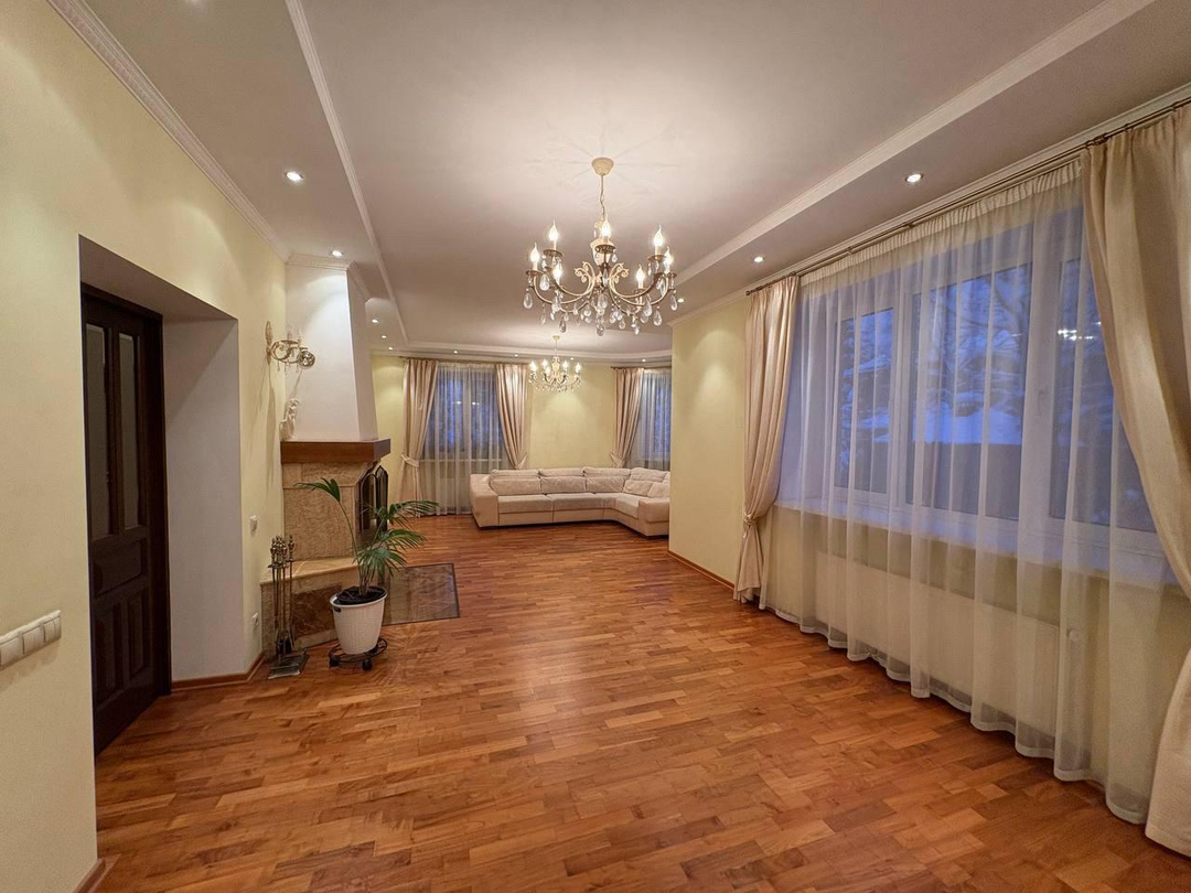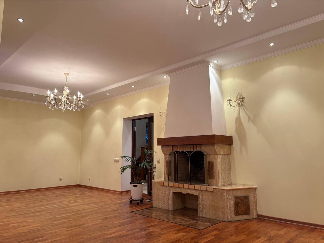 на 1 этаже расположились просторная прихожая 17 метров, сердце дома- уютная кухня-столовая 25м -идеальное место для общения с семьей и приема гостей, откуда есть выход на террасу 20,33 м для завтраков и ужинов ,ванная комната и санузел, а так же роскошная гостинная 36м с камином,как главный акцент создает уютную атмосферу зимними вечерами и кабинет 11,58м.