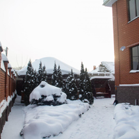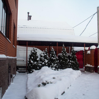 Дом украшают туи и голубые ели, во дворе высажены высокие и низкие туи, газон.
