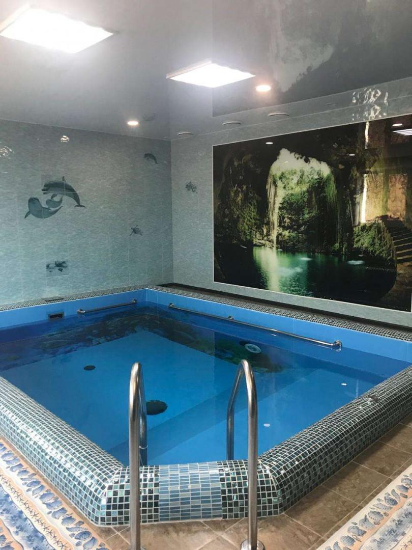 Общая площадь дома — 324,9 квадратных метра, он состоит из двух этажей. На первом этаже есть две комнаты , санузел с душевой кабинкой, унитазом, биде и раковиной (все сделано в Италии). Также на первом этаже находится бассейн, душевая и парилка.