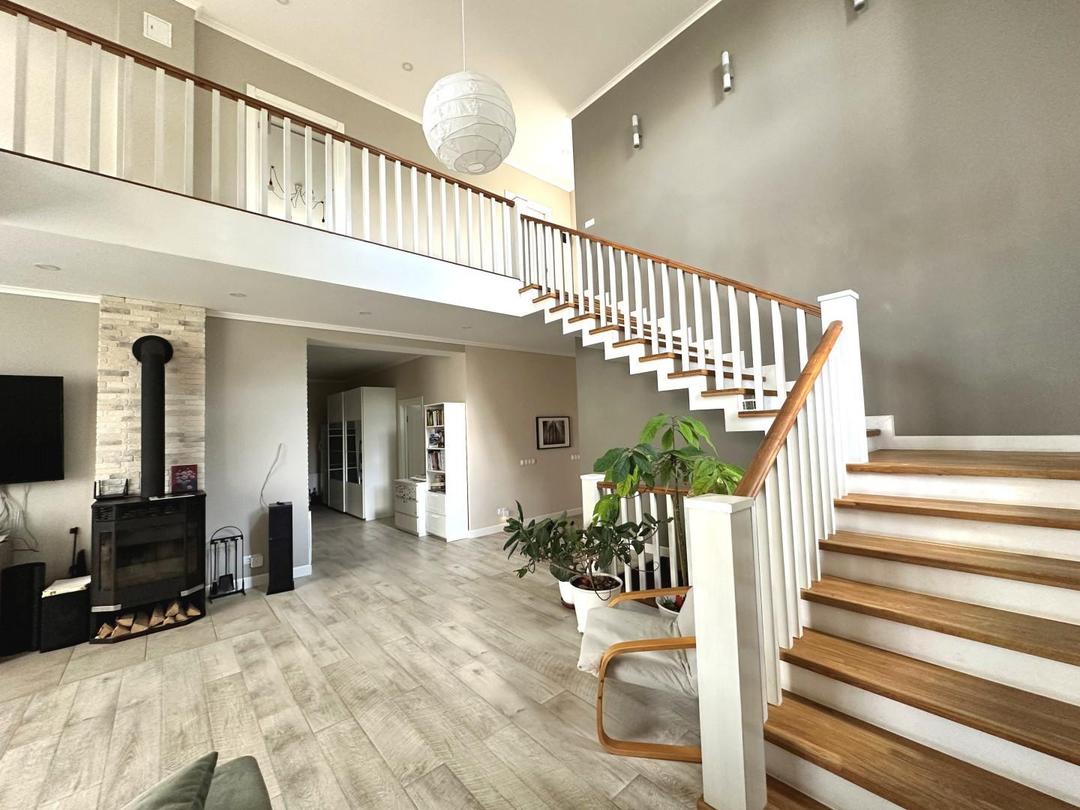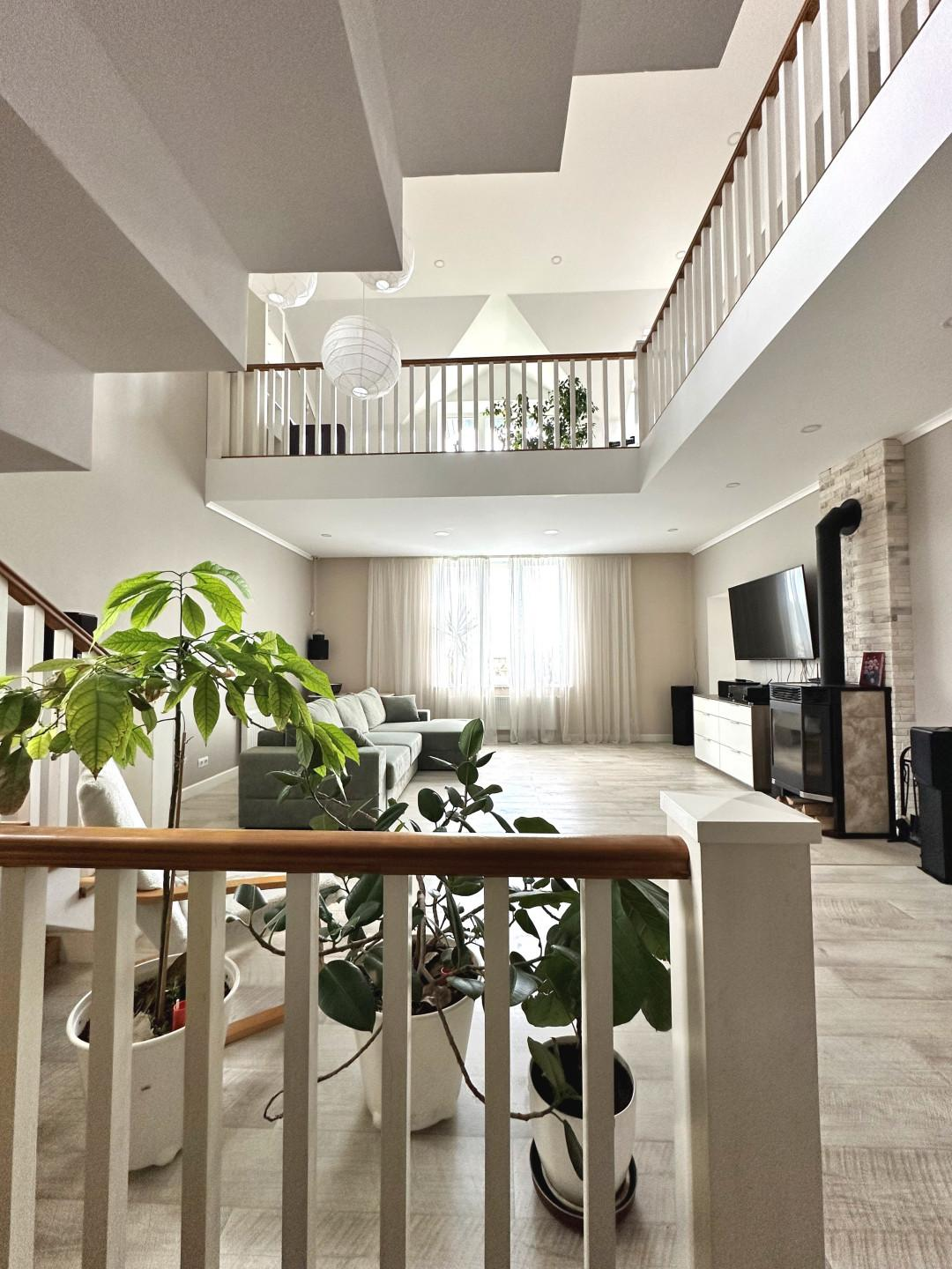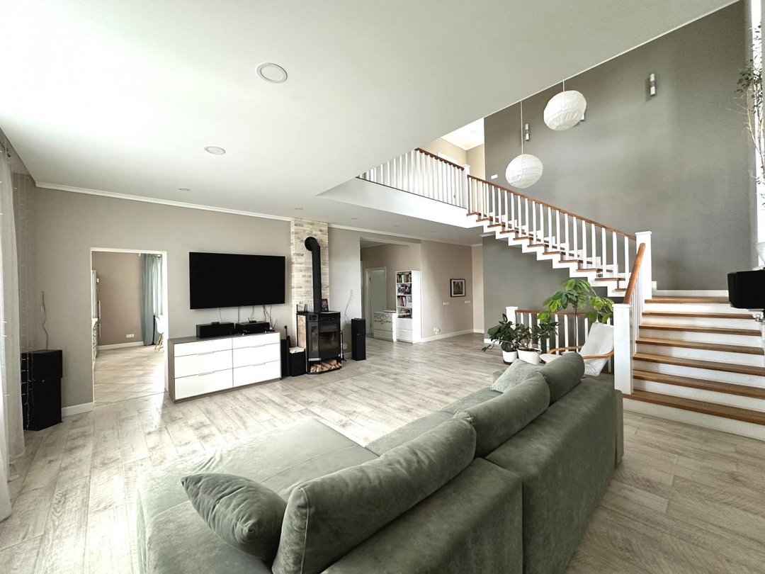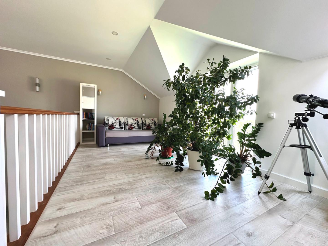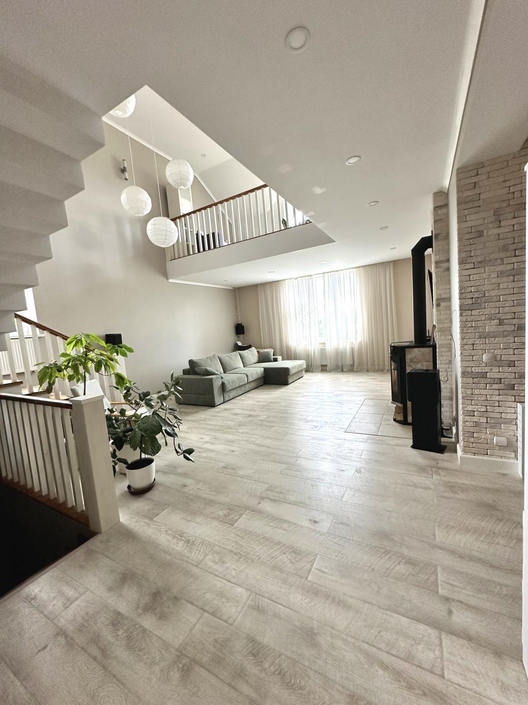Дом сочетает в себе эстетику, элегантность, функциональность и наполненность светом. Светлая цветовая палитра фасада создает впечатление лёгкости и воздушности, несмотря на значительные размеры. Центральным элементом интерьера становится внушительное пространство со вторым светом — гостиная с высоким потолком. Это визуально расширяет пространство, добавляет динамики и подчёркивает масштаб. Мансардные деревянные окна премиум-класса не только обеспечивают освещение естественного света, но и создают уютную атмосферу в комнатах под крышей — будь то кабинет, библиотека или гостевая спальня.