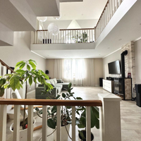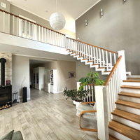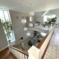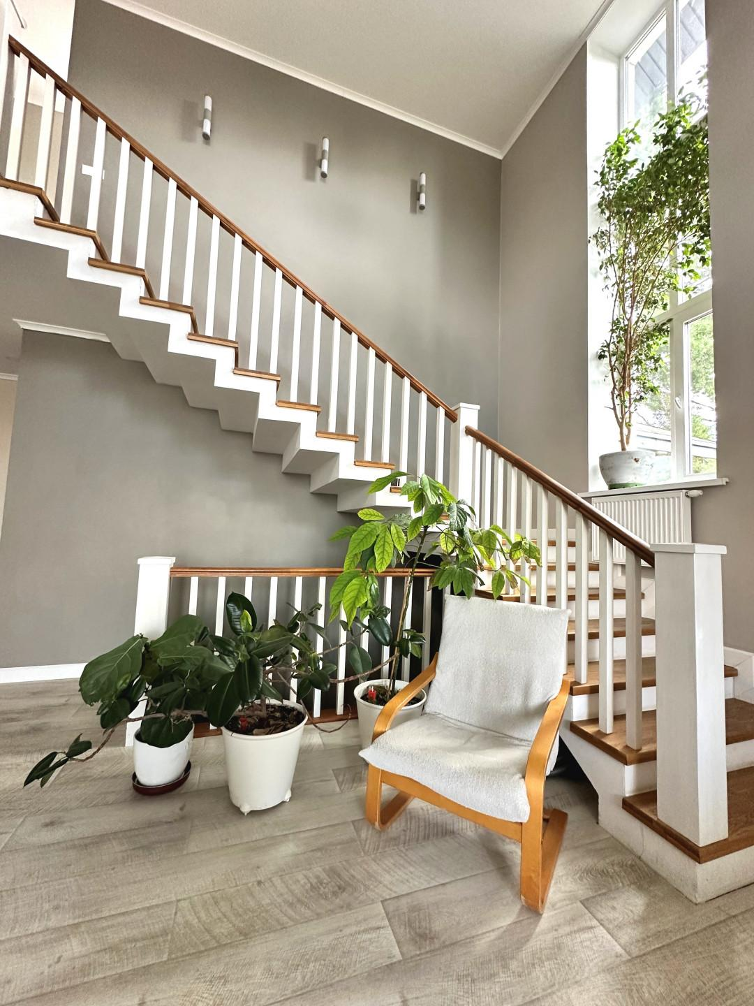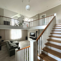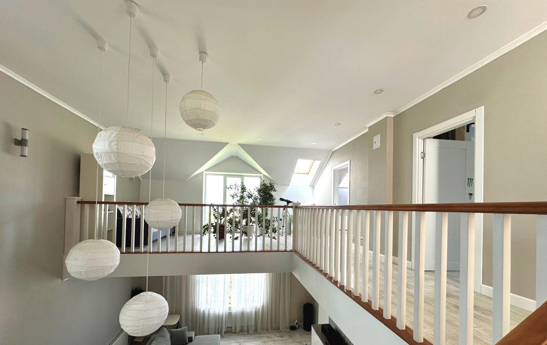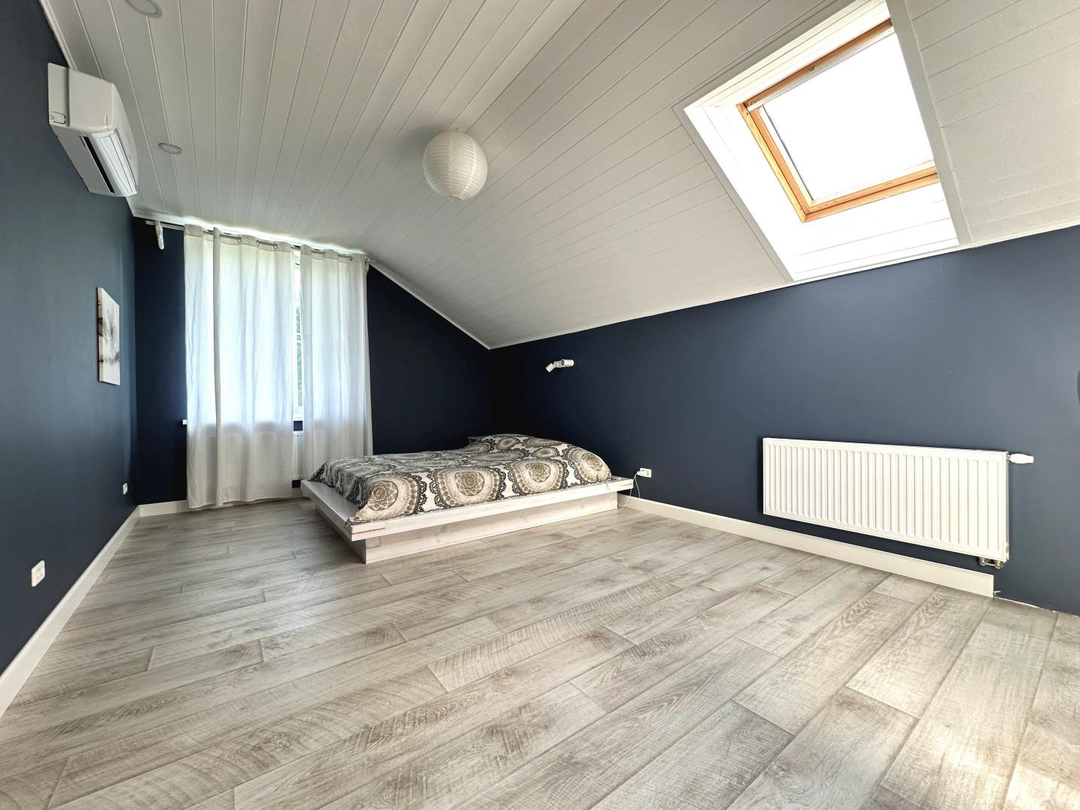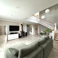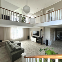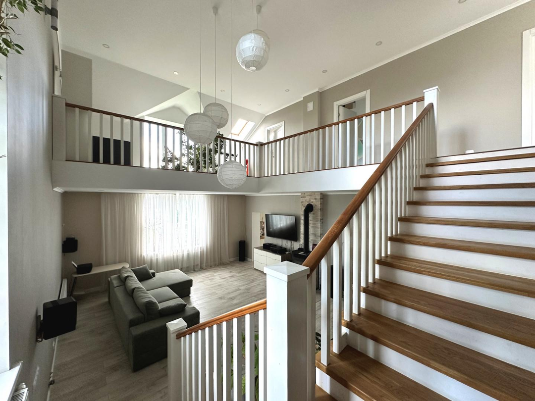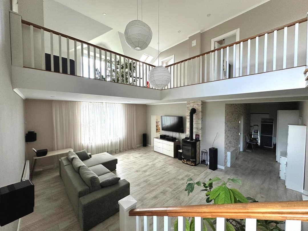 Дом сочетает в себе эстетику, элегантность, функциональность и наполненность светом. Светлая цветовая палитра фасада создает впечатление лёгкости и воздушности, несмотря на значительные размеры. Центральным элементом интерьера становится внушительное пространство со вторым светом — гостиная с высоким потолком. Это визуально расширяет пространство, добавляет динамики и подчёркивает масштаб. Мансардные деревянные окна премиум-класса не только обеспечивают освещение естественного света, но и создают уютную атмосферу в комнатах под крышей — будь то кабинет, библиотека или гостевая спальня.
