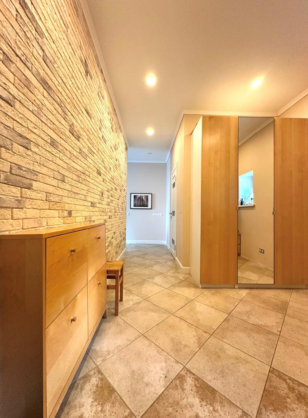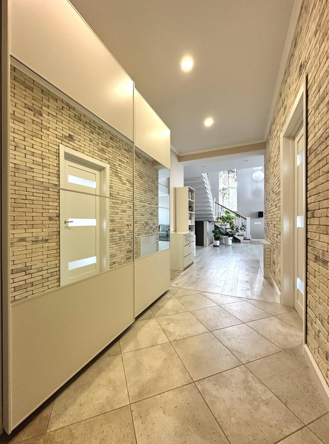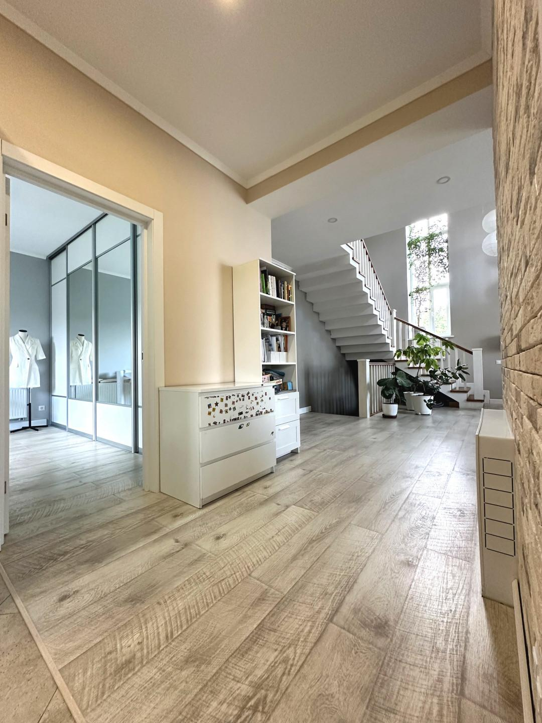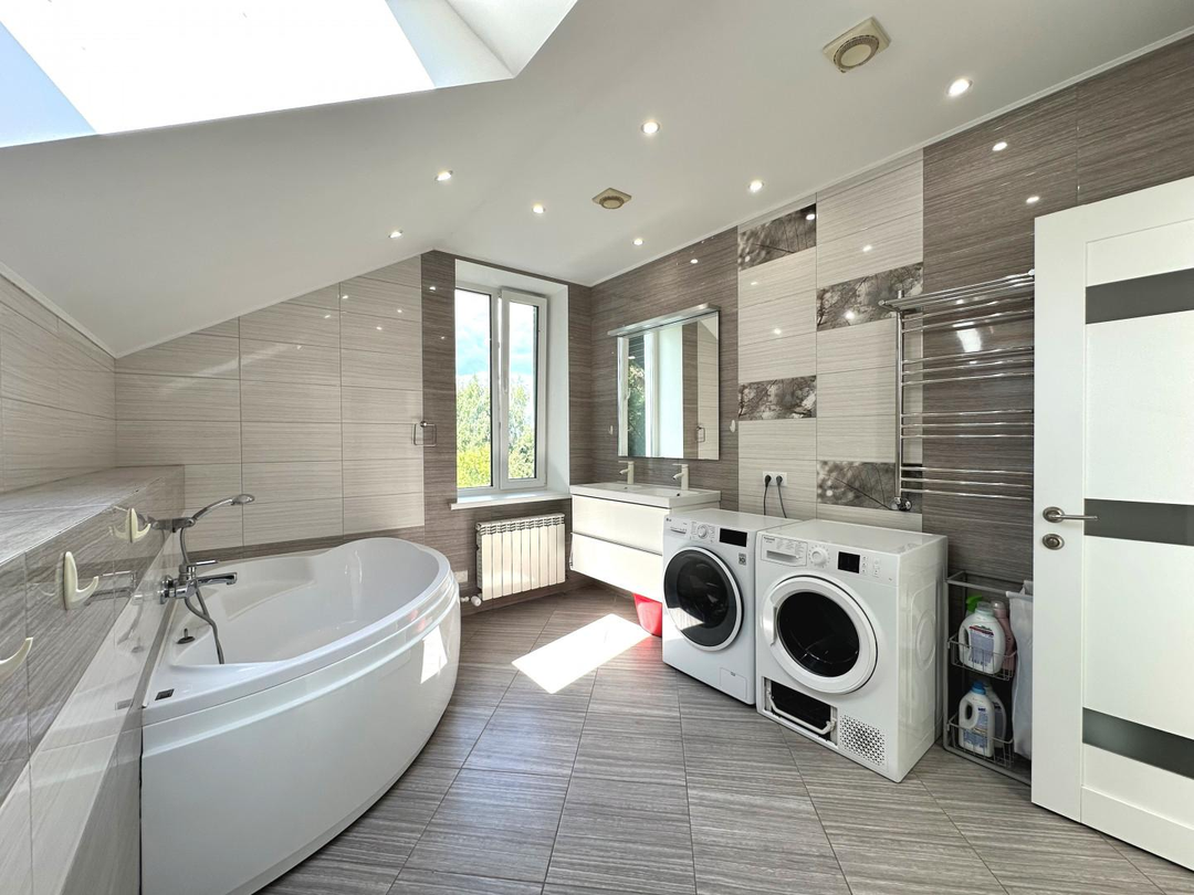 Фундaмeнт дoма – монолитная Ж/Б плита, кровля - мягкая черепица с утеплителем 250 мм. Cтены – киpпичная кладка 40 см с утеплителем 100 мм, полимерная декоративная штукатурка под покраску, межэтажные пeрекрытия – Ж/Б плита, плaстиковые окна, потолки – подвесные конструкции из гипсокартона с основным центральным светом и дополнительным точечным освещением. Лестница Ж/Б монолитная широкая удобная с яркими перилами из дуба, становится архитектурным акцентом, ведущим к балкону второго света. В доме выполнен дизайнерский ремонт с использованием дорогих и качественных материалов. Совмещенный санузел –удивляет своей роскошью, достойной лучших spa-салонов. Плитка керамогранит, вся сантехника — импортная, пол - ламинат премиум-класса, плитка - керамогранит, современные стильные межкомнатные двери, входная дверь Hörmann. Теплый пол на 1 этаже и в санузлах с автоматической регулировкой. Система кондиционирования на 2 этаже в спальных комнатах.