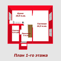 1 этаж: кухня - 10 м.кв. оборудована всем необходимым. Гостинная - 16,5 м.кв. Оборудованный совмещенный санузел - 4,6 м.кв. Прихожая - 6 метров.