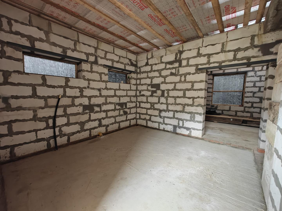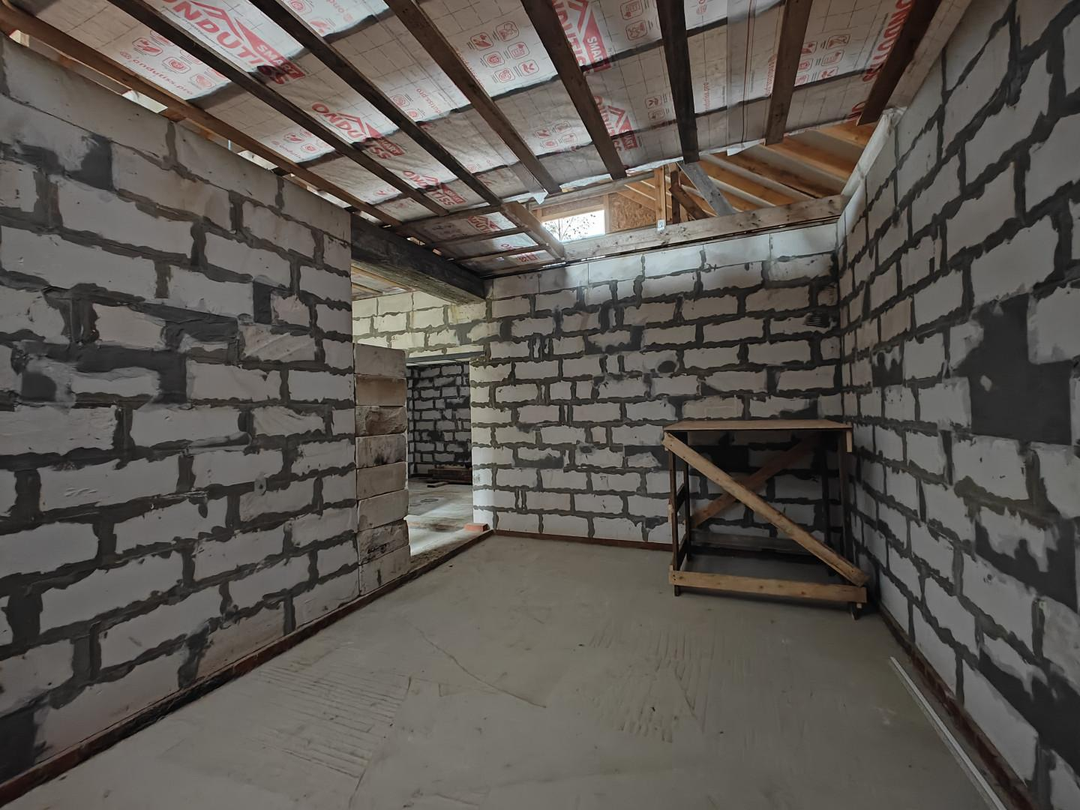 Дом на бетонном (капитальном) фундаменте с роствеком, возведен из пеноблока размером 400х600х250мм, очень теплый и энергосберегающий. С наружи оштукатурен, покрашен.