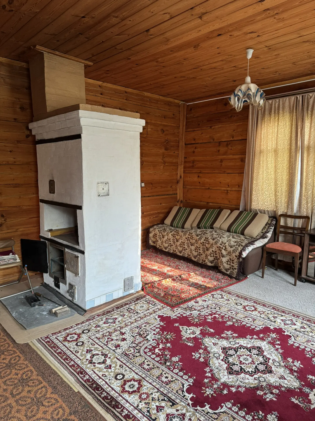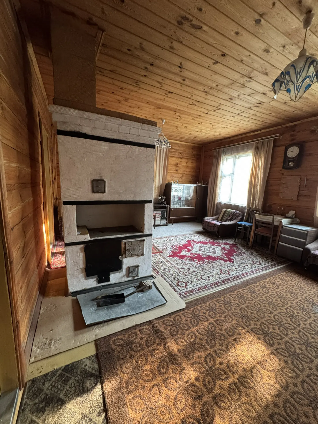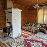 1 - этаж: терраса, коридор с лестницей на второй этаж, большая комната с печью.