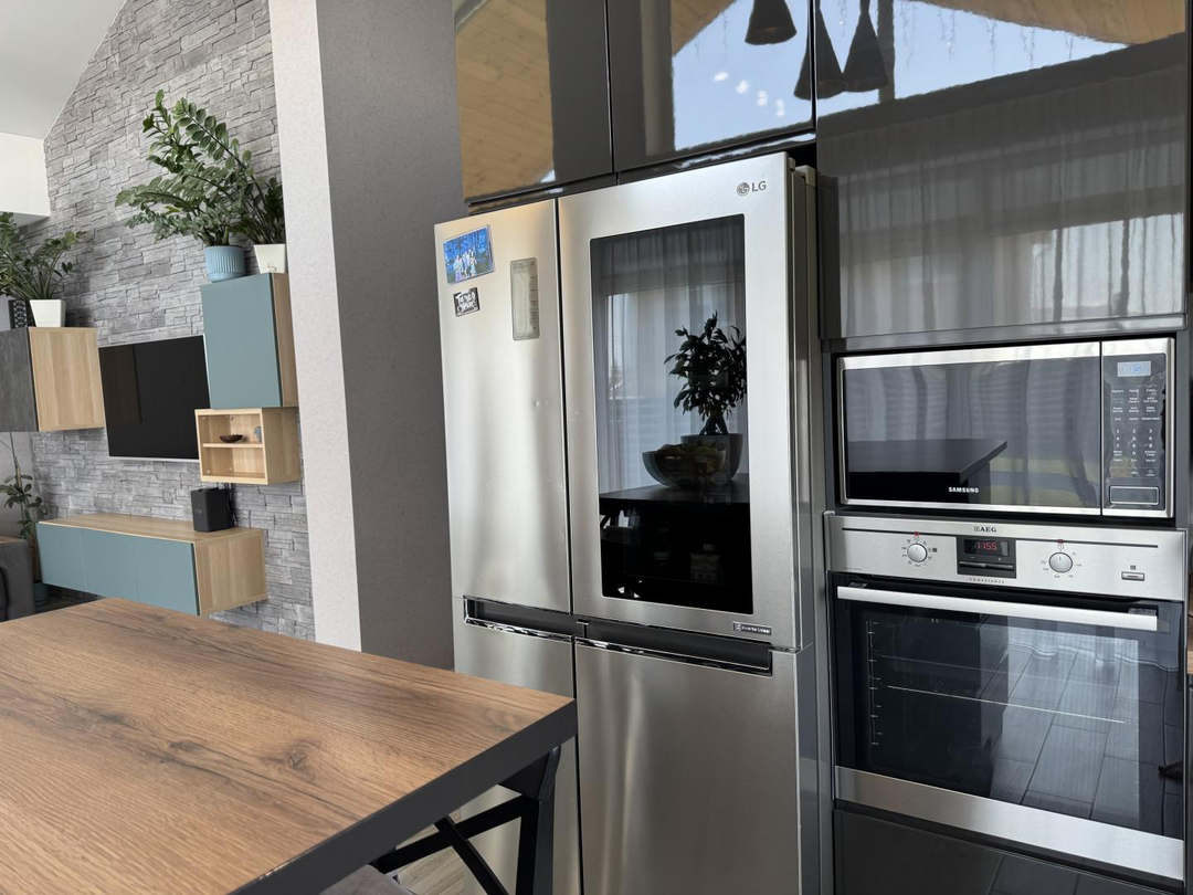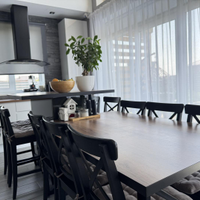 Большая (30 кв.м.) кухня-гостиная со вторым светом , что добавляет помещению простора и воздушности! Панорамные окна увеличивают пространство и позволяют любоваться ухоженным газоном и внутренней территорией двора.
