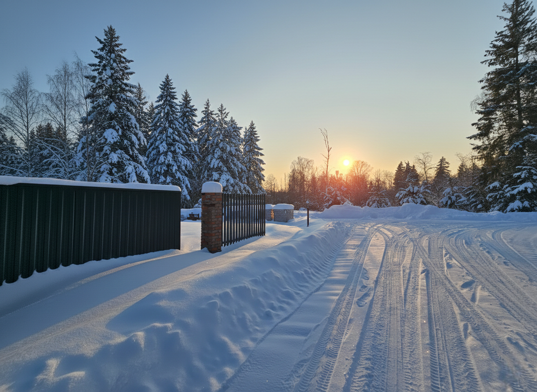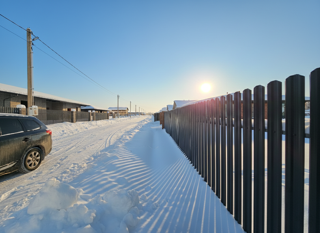 Забор: участок огорожен, установлены въездные ворота с фасадной стороны.