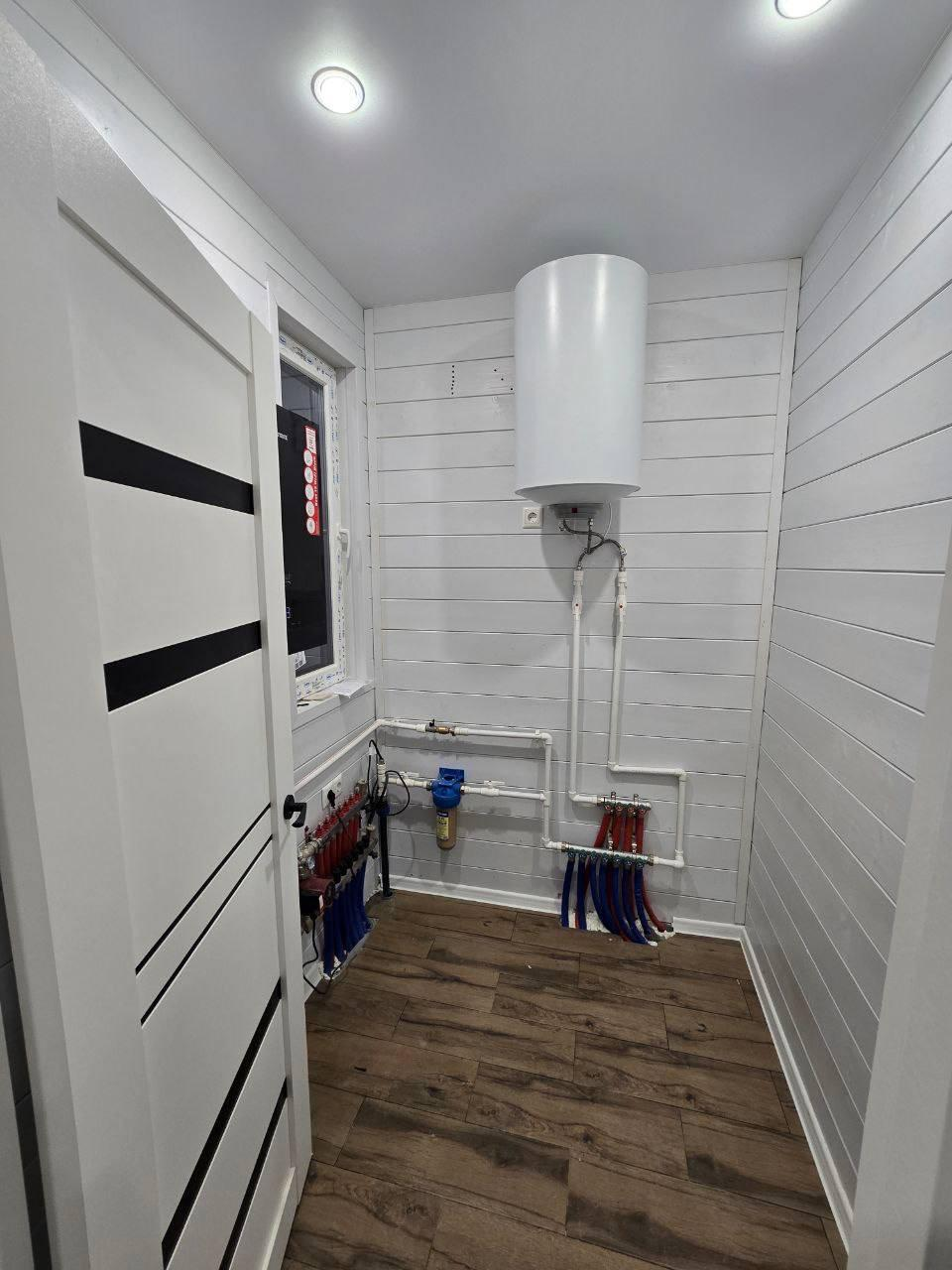 Все коммуникации в доме: вода заведена из собственной скважины, установлены фильтры, автономная канализация (септик), электричество 15 кВ, отопление - управляемый электрокотел (во всем доме теплые полы и батареи).