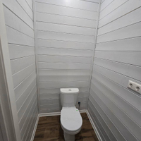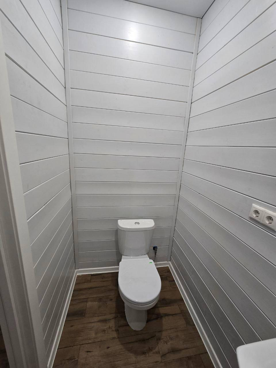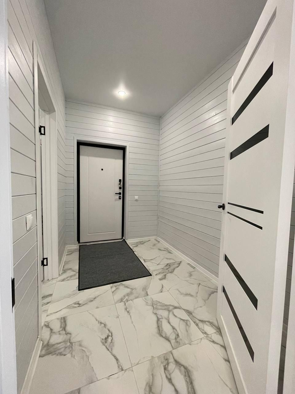 Современная внутренняя отделка:натяжные потолки, окрашенная имитация бруса, полы везде керамогранит.