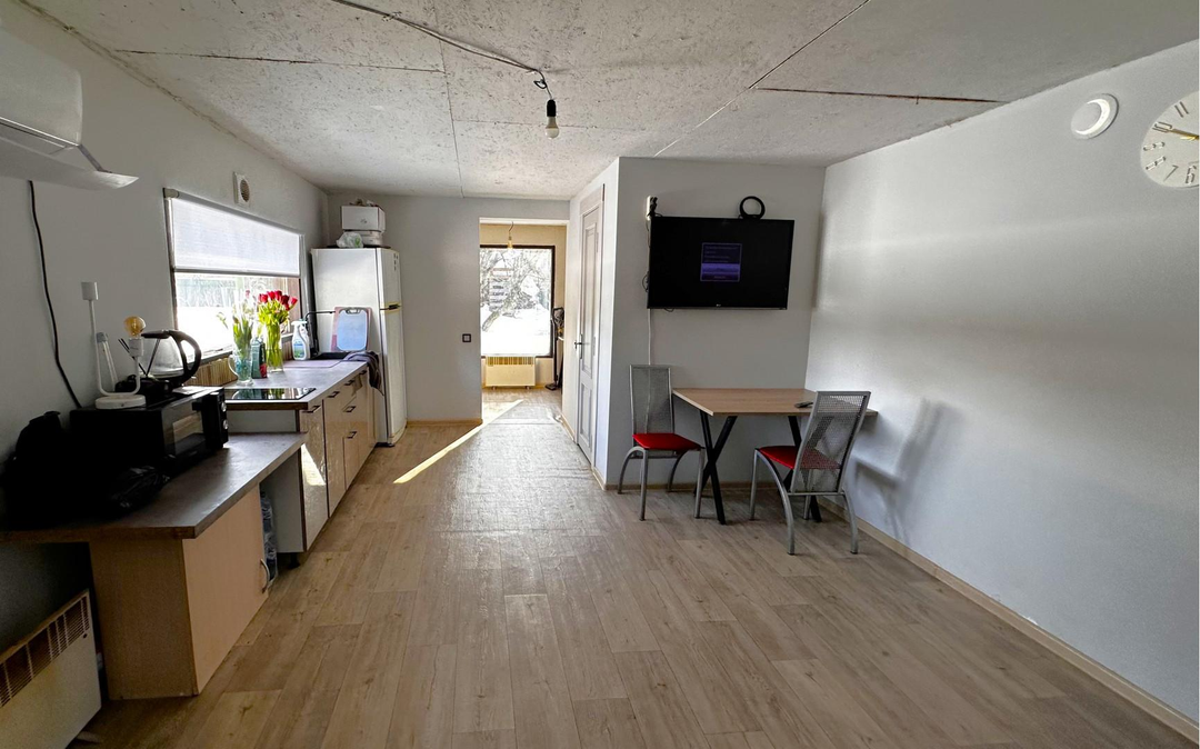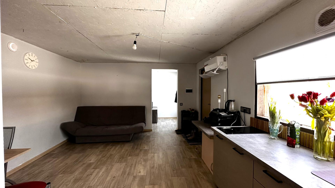 В доме:кухня-гостиная;две комнаты;санузел с душевой кабиной;установлен кондиционер;отопление электрическое.