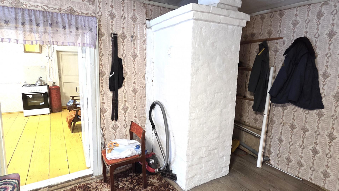 Планировка дома включает прихожую, кухню-гостиную с русской печью, изолированную комнату, совмещённый санузел, сени.