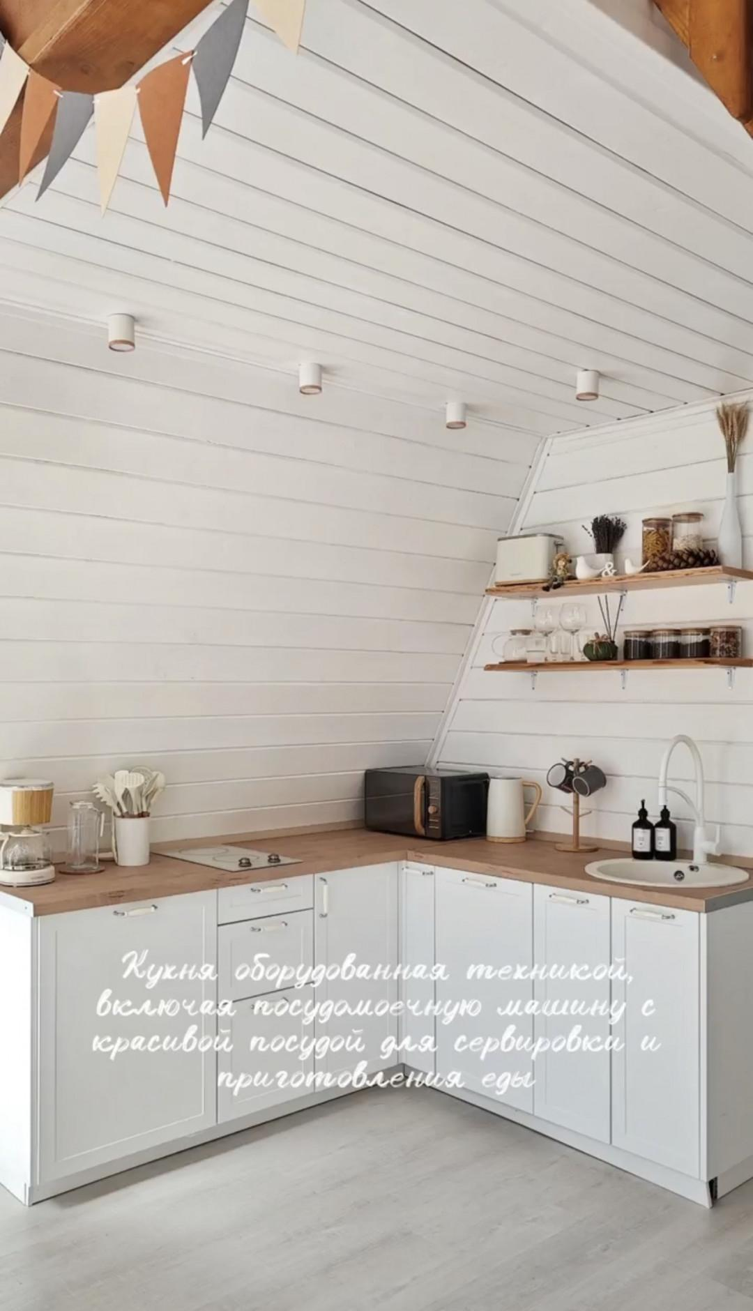 В доме туалет (инсталляция), душ, укомплектованная кухня со всей необходимой техникой (холодильник, бойлер, микроволновка, посудомойка, тостер, кофеварка, чайник, посуда и т.д .)