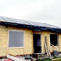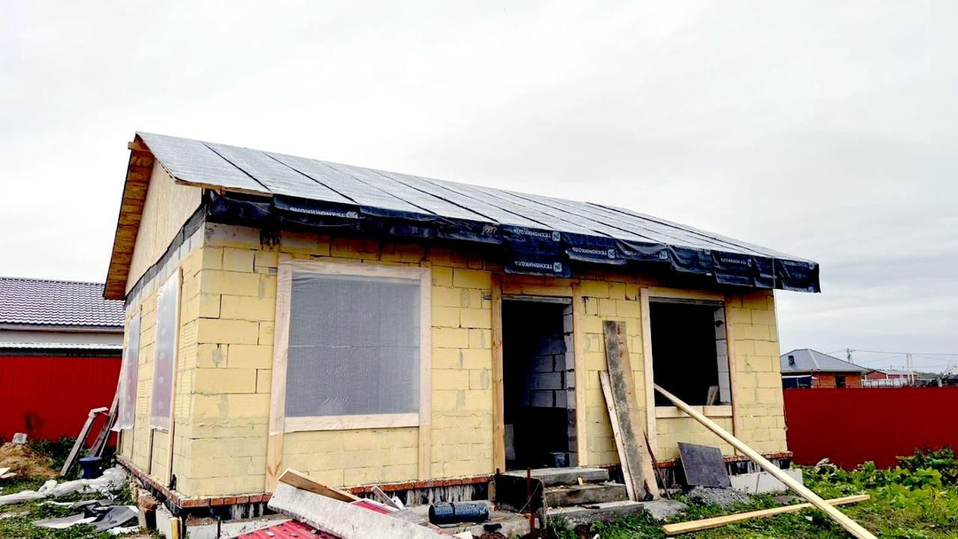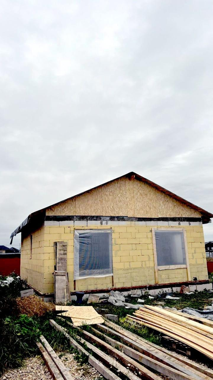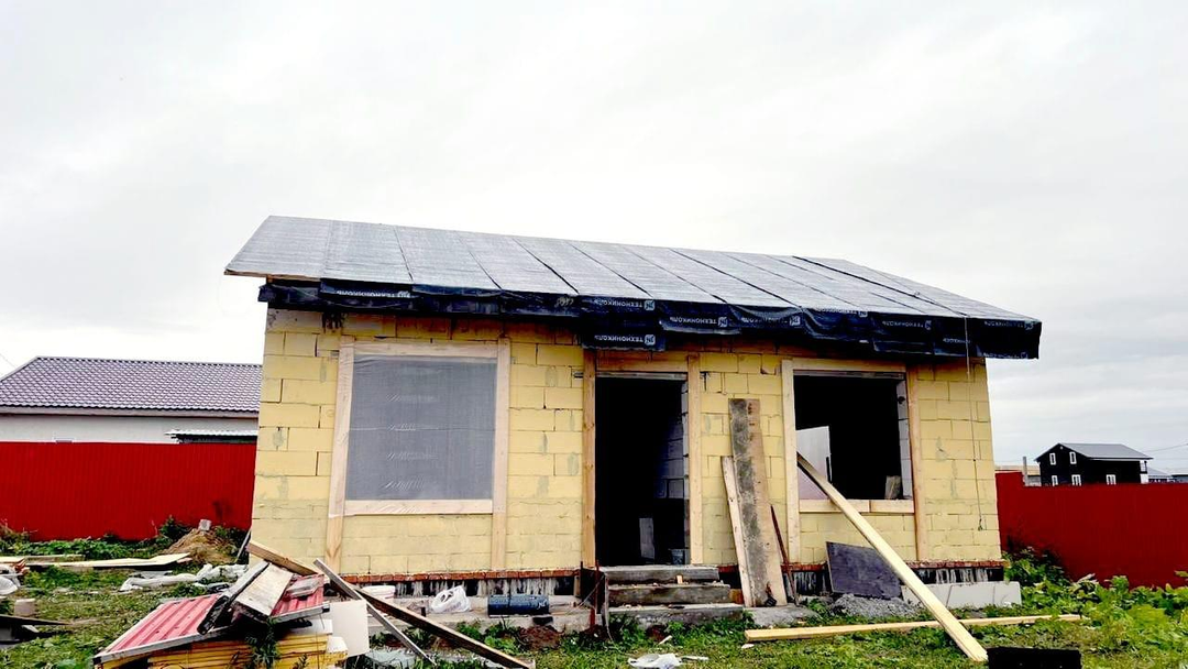 На участке установлен забор, проведено электричество, установлен контейнер для хранения. Дом начали строить в мае 2025 года, возведены стены, фундамент - монолитная плита, крыша.