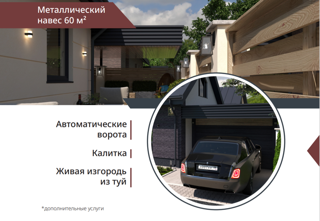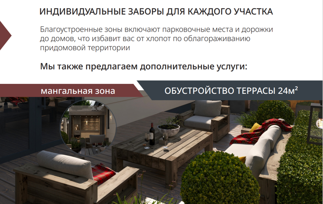 Доп.услуги от застройщика:обустройство террасыметаллический навесмангальная зонаавтоматические воротахозпостройкигараж