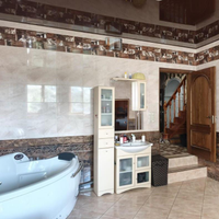 *** На первом этаже дома расположены: кухня (9,5 м²), гостинная (19,6 м²), спальня, санузел, жилая комната (19,0 м²) и зона отдыха (24,2 м²) с электрической сауной, душевой, джакузи и санузлом.