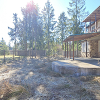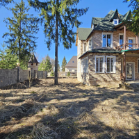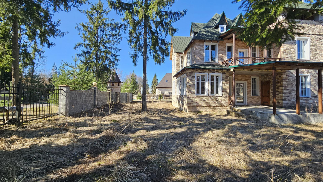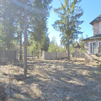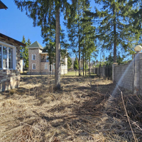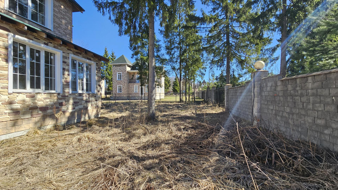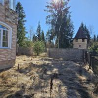 Ровный УЧАСТОК правильной формы. Растут взрослые хвойные деревья. Кованое ограждение по периметру. Есть площадка на два автомобиля.