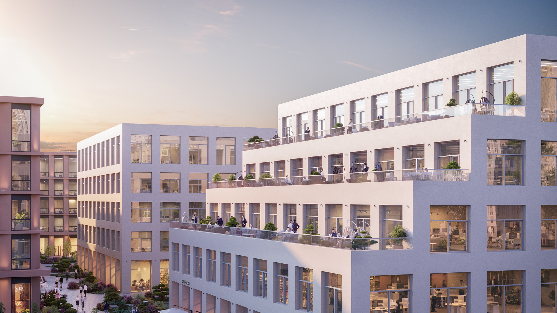 На территории предусмотрены офисные площади более 26 000 м², торговые и сервисные помещения около 4 400 м², велопарковка, зона отдыха и благоустроенное общественное пространство. В комплексе установлены современные инженерные системы: централизованное кондиционирование с регулировкой микроклимата, собственная газовая котельная, бесконтактная система доступа Face ID, видеонаблюдение 24/7, высокоскоростные лифты и профессиональная управляющая компания.