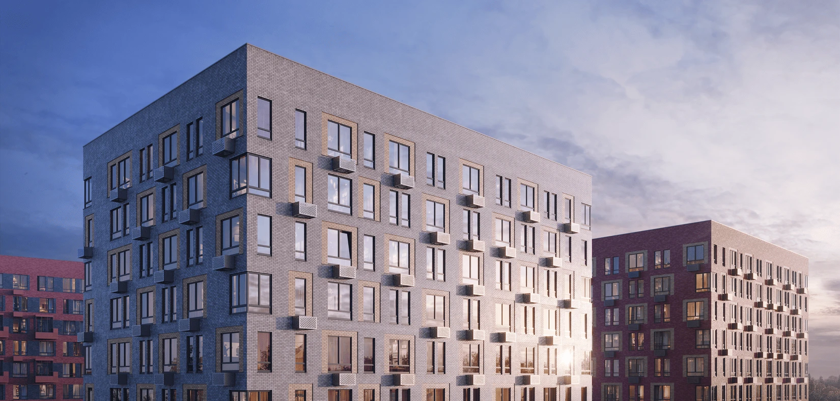 Дома высотой 11–12 этажей возводятся по монолитной технологии. Для облицовки фасадов будет использован кирпич естественных природных оттенков: белого, серого, бордо, коричневого и охры. Чтобы сохранить архитектурную целостность зданий, будут установлены корзины для кондиционеров. Входные группы с панорамным остеклением будут выполнены в светлых тонах в стиле минимализма.