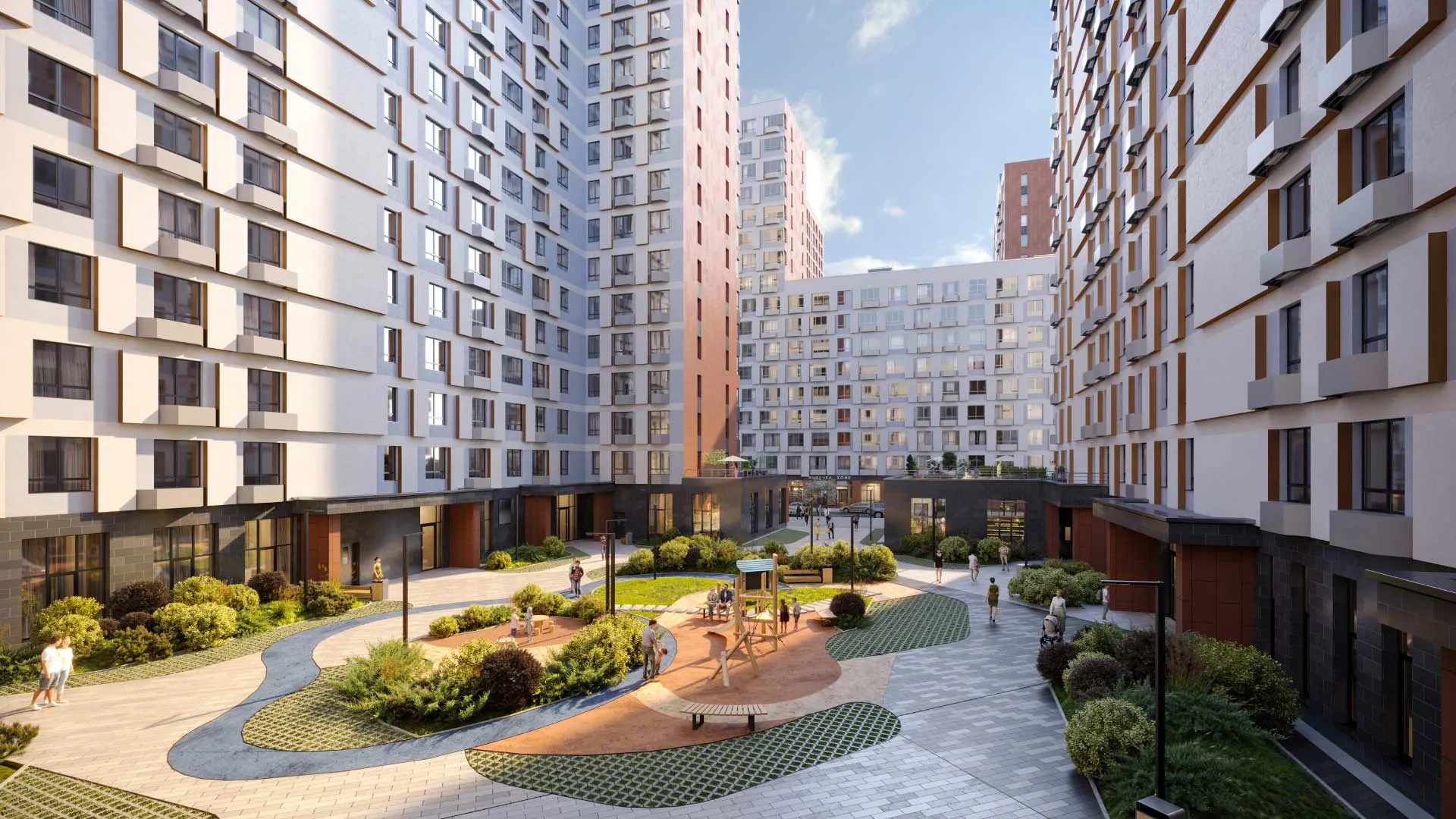 - приватная благоустроенная территория с площадками для йоги, занятий спортом и детских игр, танцплощадкой и амфитеатром, маршрутами здоровья, велодорожками и скейт-парком;
