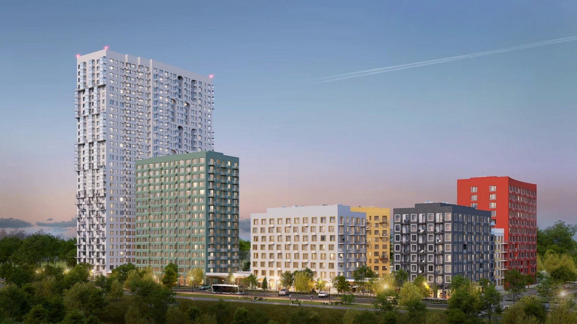 Разнообразная этажность домов (от 8 до 32 этажей), что формирует интересный силуэт квартала.